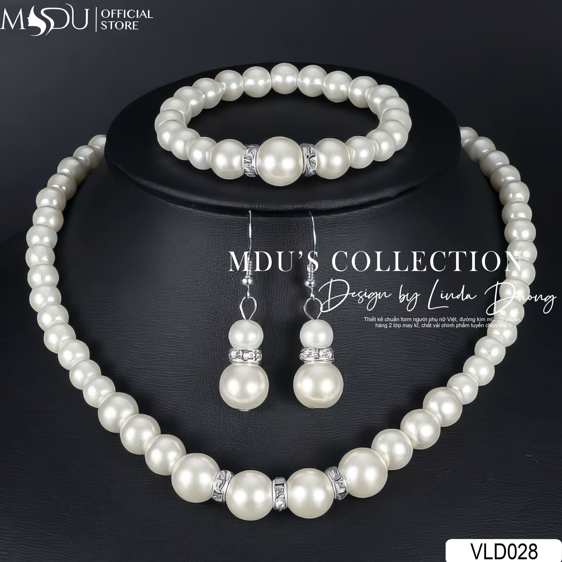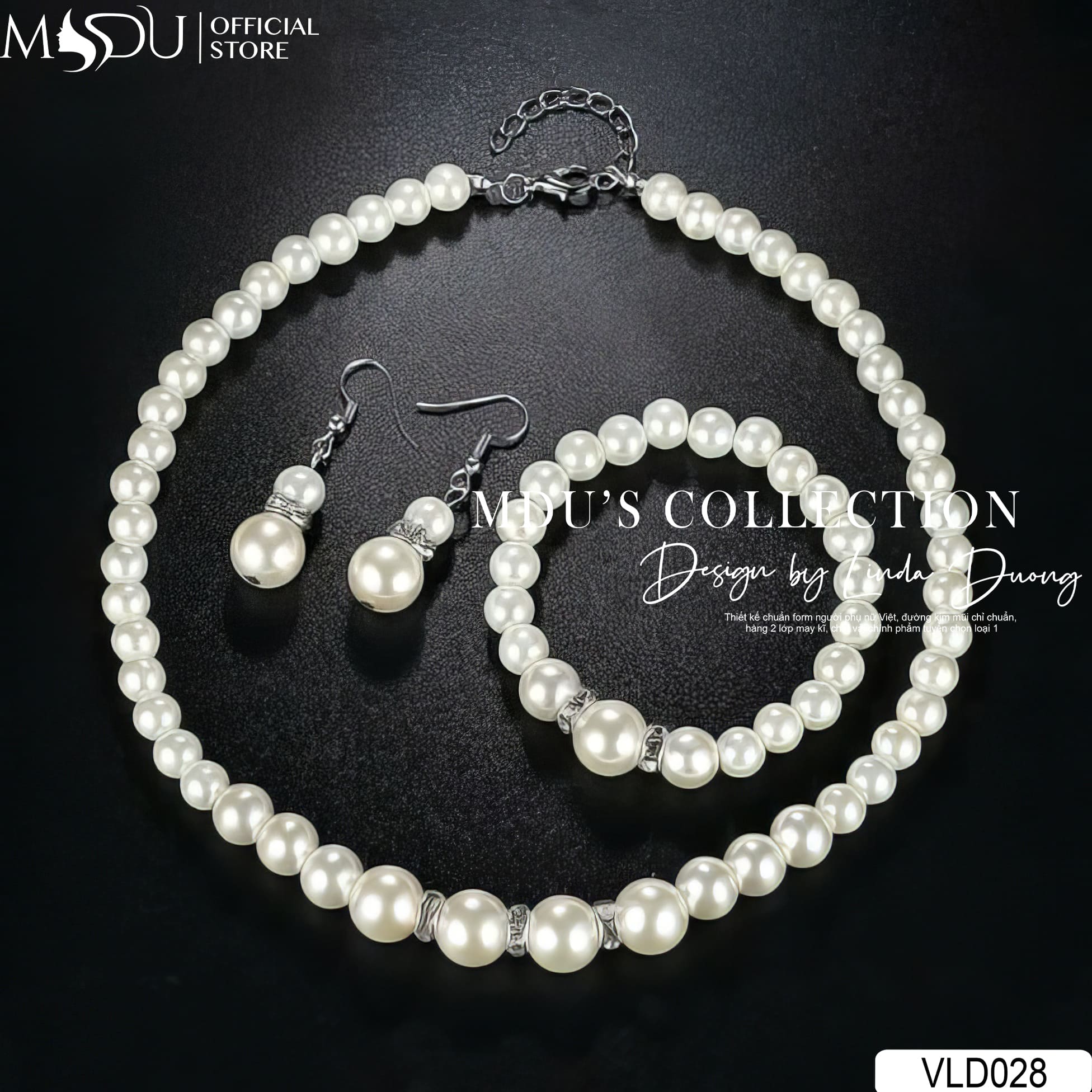 VLD028 từ nhà MDU Fashion là thiết kế bộ ba trang sức gồm vòng cổ, vòng tay và hoa tai ngọc trai trắng, mang đậm tinh thần thanh lịch cổ điển nhưng vẫn đầy tính ứng dụng hiện đại. Từng viên ngọc trai tròn đều, óng ánh được tuyển chọn kỹ lưỡng và đính kết thủ công trên nền kim loại ánh bạc sang trọng. Điểm nhấn của bộ thiết kế là chi tiết hạt ngọc lớn đính đá xẻ viền tạo chiều sâu thị giác tinh tế, giúp từng chuyển động của nàng thêm phần cuốn hút.