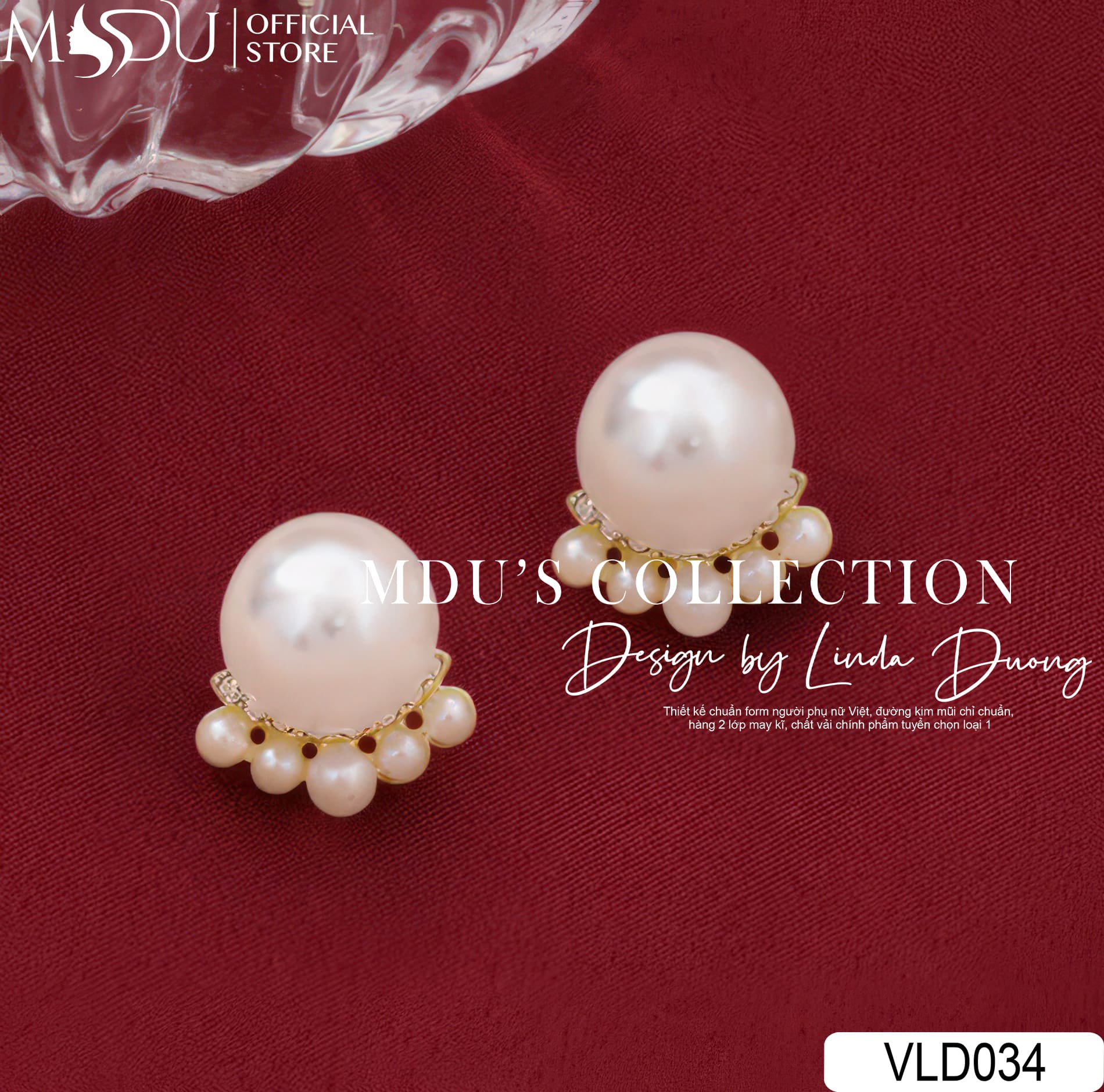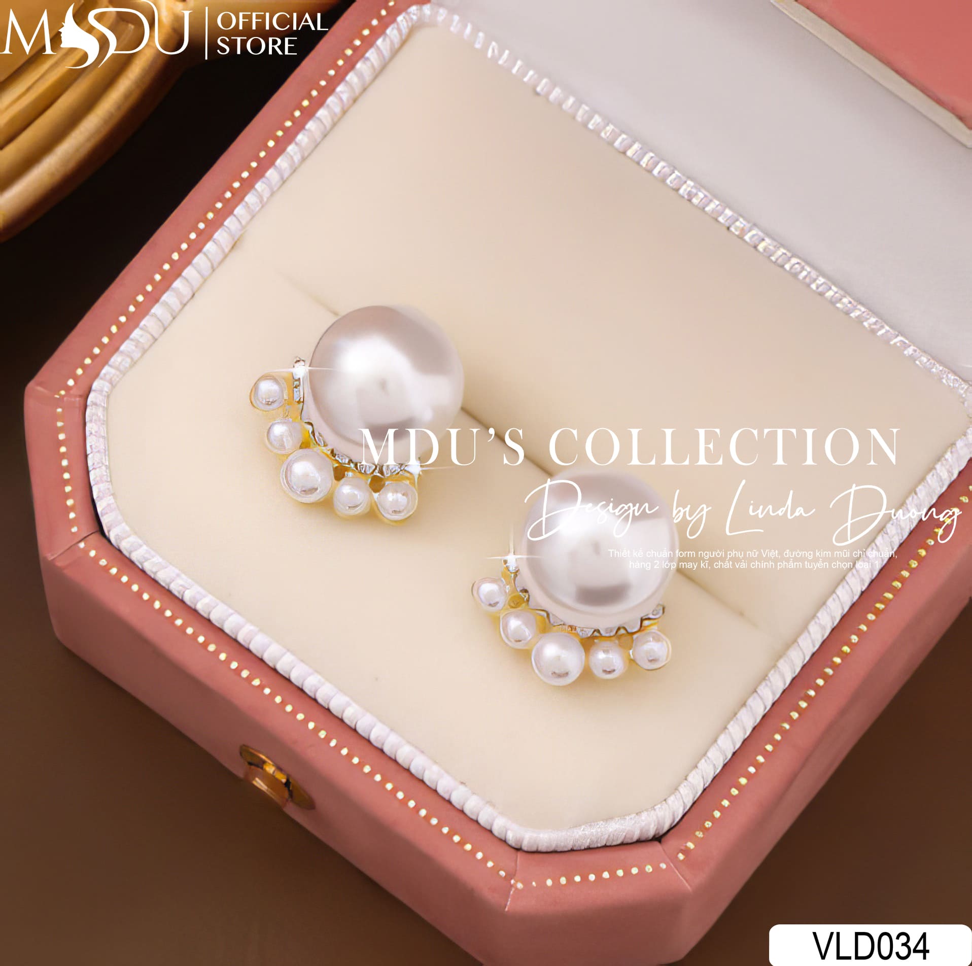 VLD034 là thiết kế hoa tai ngọc trai mang đậm hơi thở cổ điển nhưng vẫn giữ được nét mới mẻ và hiện đại đặc trưng của MDU Fashion. Phần ngọc trai bản lớn được đặt làm trung tâm, nổi bật và đầy cuốn hút. Phía dưới là cụm ngọc nhỏ đính chùm khéo léo, tạo hiệu ứng tầng lớp mềm mại, tựa như gợn sóng ánh lên từ một viên ngọc giữa đại dương.