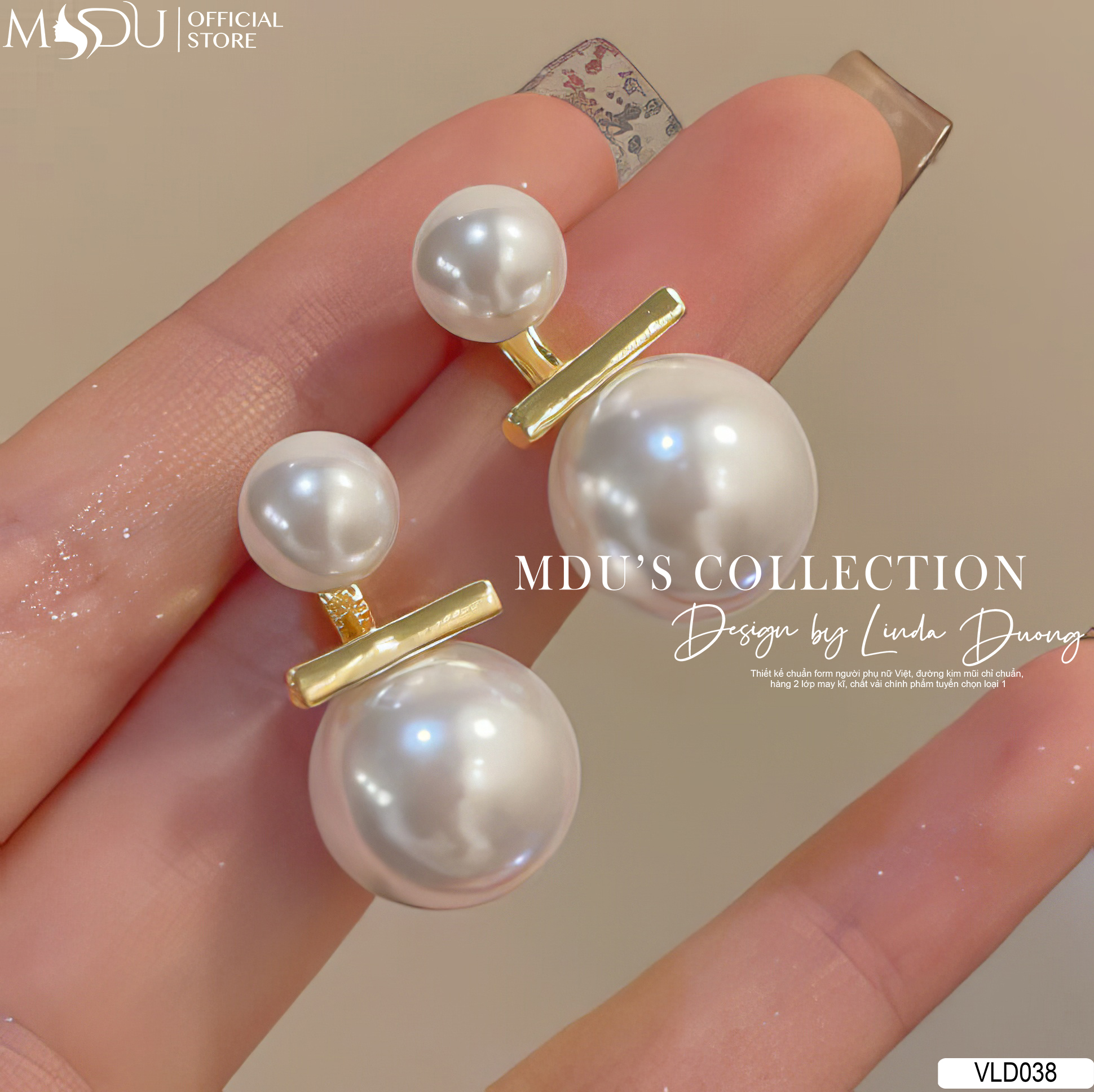 VLD038 là mẫu hoa tai nổi bật của nhà MDU Fashion với thiết kế ngọc trai bản lớn kết hợp cùng chi tiết thanh kim loại ánh vàng hiện đại, tạo nên sự giao thoa độc đáo giữa vẻ đẹp cổ điển và tinh thần thời trang đương đại. Phần ngọc trai được tuyển chọn kỹ lưỡng với bề mặt căng bóng, tròn đều, mang lại cảm giác sang trọng và thanh lịch. Điểm nhấn của thiết kế là chi tiết thanh ngang kim loại được đặt ở vị trí nối hai viên ngọc – như một đường kẻ mạnh mẽ ngăn đôi nét dịu dàng và cá tính, tạo nên sự đối lập đầy nghệ thuật.