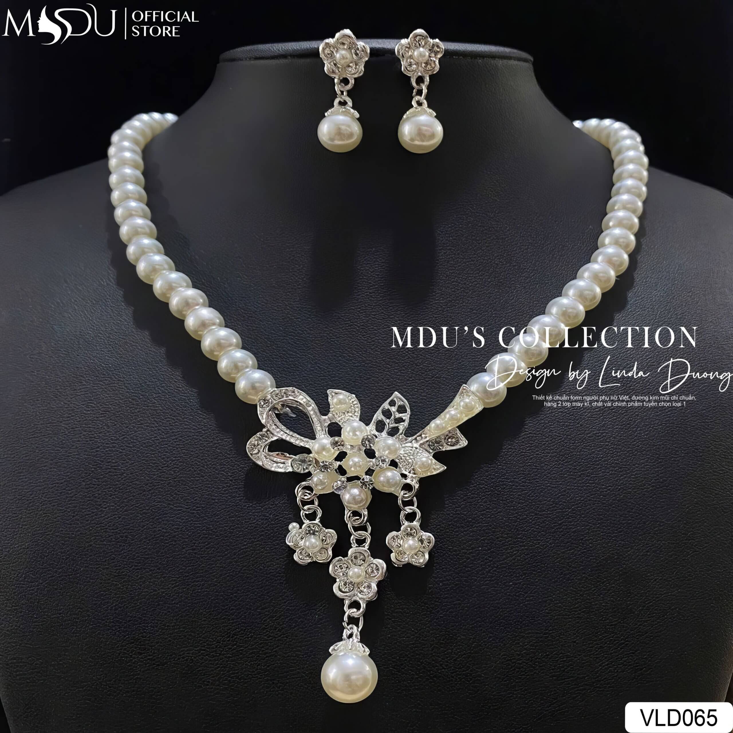MDU Fashion tự hào cho ra mắt bộ trang sức VLD065 – là bản giao hưởng lấp lánh giữa ngọc trai và nghệ thuật chế tác tinh xảo – một thiết kế dành riêng cho những khoảnh khắc nàng cần tỏa sáng. Bộ trang sức gồm vòng cổ đính hạt trai tròn đều, kết nối bằng chuỗi ngọc ánh satin thanh lịch, nổi bật với điểm nhấn trung tâm là motif hoa nở rộ gắn đá pha lê. Từng chi tiết dây rủ được xử lý mềm mại, tạo hiệu ứng chuyển động đầy cuốn hút khi nàng bước đi.