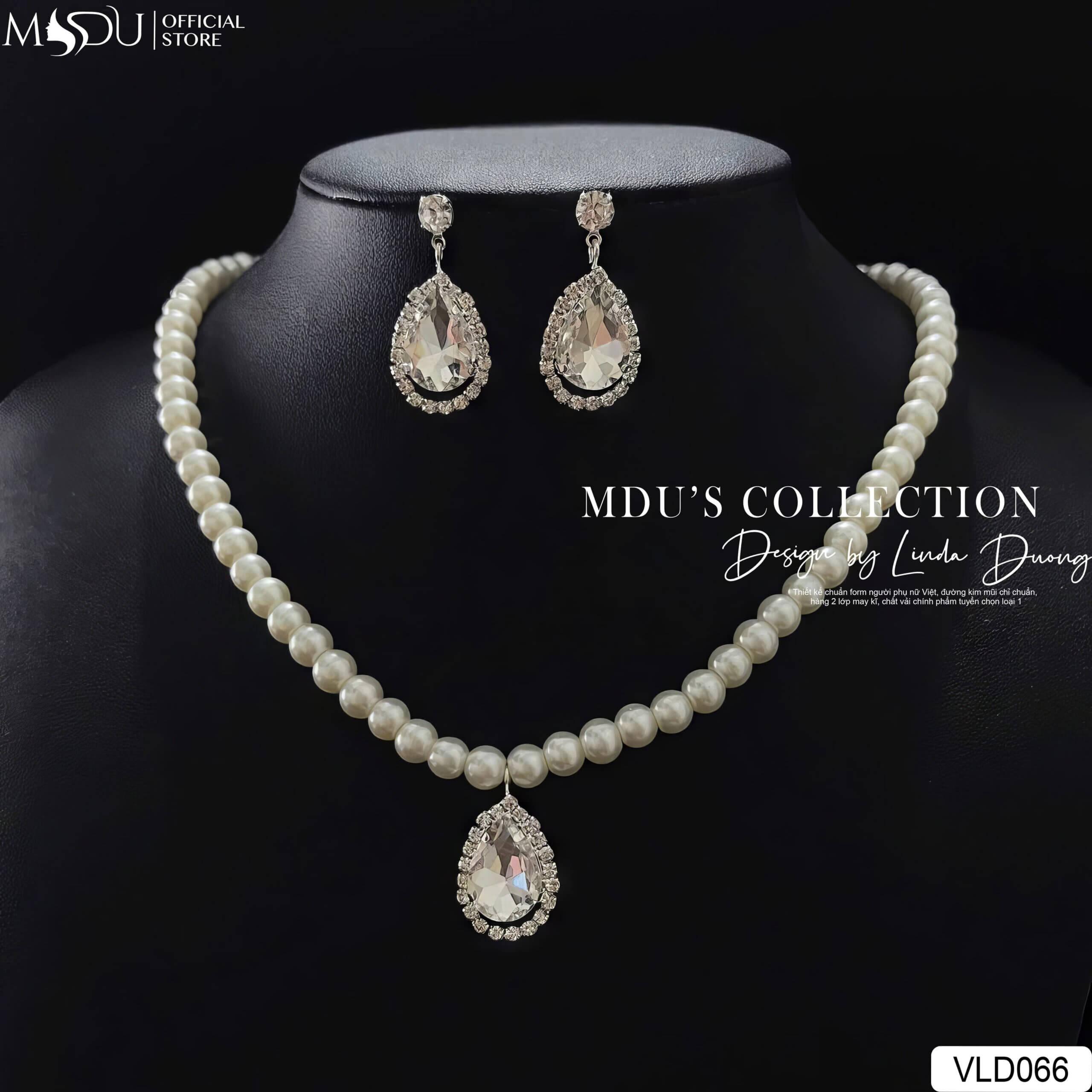 Tựa giọt lệ long lanh giữa ánh đèn dạ hội, VLD066 của nhà MDU Fashion là một thiết kế mang hơi thở cổ điển đầy mê hoặc. Bộ trang sức bao gồm vòng cổ kết ngọc trai tròn đều, điểm xuyết mặt đá giọt nước trong suốt được viền bởi hàng đá pha lê nhỏ – như ánh sao đêm lấp lánh vây quanh vì tinh tú. Bông tai đồng bộ càng hoàn thiện vẻ sang trọng, thanh thoát cho người diện.
