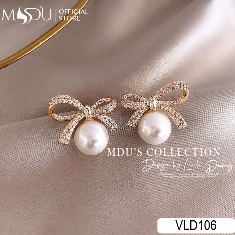 Được MDU Fashion thiết kế hình ảnh chiếc nơ mềm mại được đính đá tỉ mỉ, VLD106 tỏa sáng như một điểm nhấn thanh lịch trên đôi tai phái đẹp. Ngọc trai trắng tròn tinh khôi được đặt làm trung tâm, kết hợp cùng dải nơ uốn lượn lấp lánh ánh vàng, tạo nên tổng thể hài hòa và sang trọng. Không cần cầu kỳ, thiết kế đủ để tạo nên sự cuốn hút nhẹ nhàng, như một lời thì thầm của sự tinh tế.