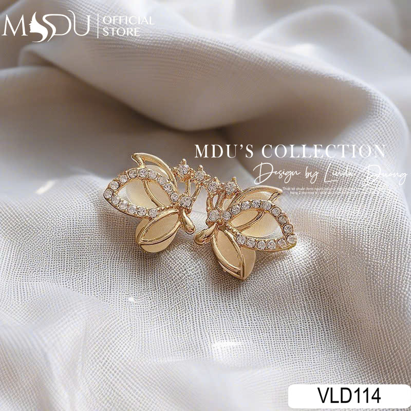 VLD114 thuộc bộ sưu tập nhà MDU Fashion là mẫu hoa tai thiết kế hình cánh bướm mềm mại, điểm xuyết đá pha lê lấp lánh tinh tế trên viền vàng sang trọng. Chi tiết đá pha lê nhỏ được sắp đặt tỉ mỉ tạo nên hiệu ứng ánh sáng lung linh, tăng thêm nét quý phái và hiện đại cho người đeo. Hoa tai phù hợp làm điểm nhấn hoàn hảo cho những bộ trang phục công sở, dạ tiệc hay những dịp quan trọng cần sự tinh tế và sang trọng.