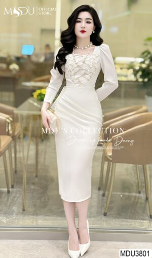 Váy Thiết Kế MDU4592 Ôm Body Màu Kem Nhã Nhặn Họa Tiết Ren Cao Cấp