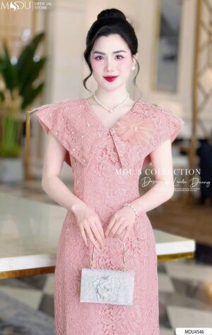 Váy Thiết Kế MDU4546 Màu Hồng Pastel Đính Hoa Ren Tinh Tế