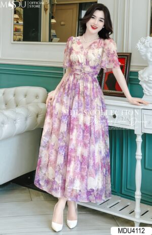 Váy Thiết Kế MDU4136 Cổ V Tông Vàng Pha Hoạ Tiết 5D – Dáng Xòe Tiểu Thư Thanh Lịch Tinh Tế