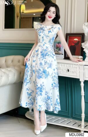 Váy Thiết Kế MDU4170 Dáng Tiểu Thư Trễ Vai Hoạ Tiết Hoa Xanh Mix Hoa Đính Ngực Thanh Lịch