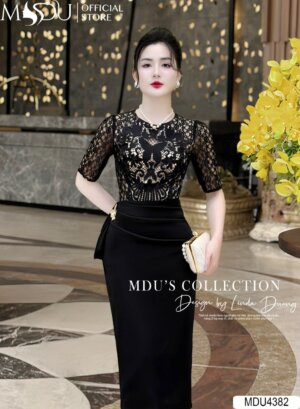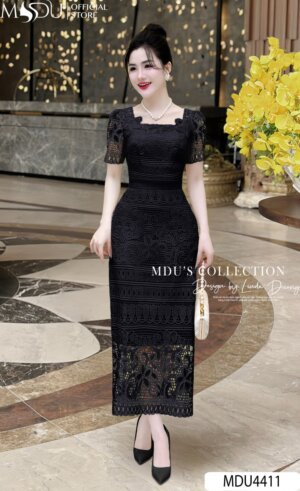 Váy Thiết Kế MDU4411 – Màu Đen Chất Ren Cổ Vuông Cách Điệu