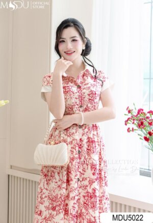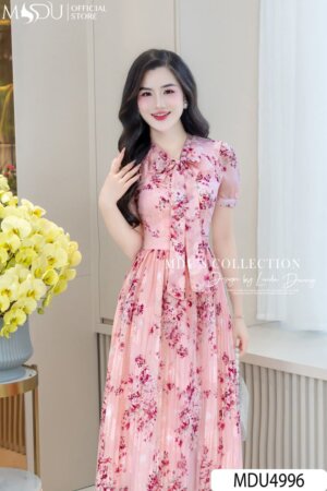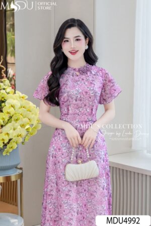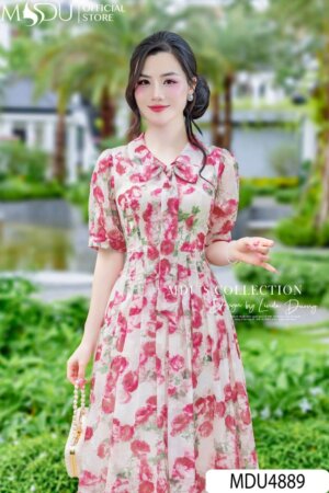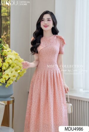 Váy Thiết Kế MDU4985 Hoa Gấm Nổi Hồng Phấn Dài Qua Gối Cổ Tròn Tay Bồng Tôn Dáng Và Nữ Tính