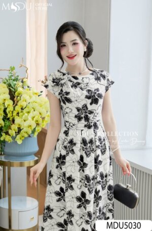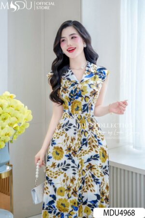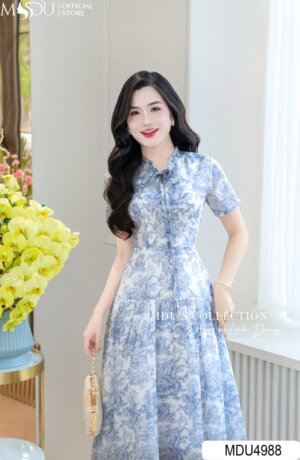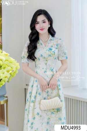 Váy Thiết Kế MDU5048 Tơ Xước Họa Tiết Lá Xanh Tươi Mát Dáng Dài Bay Bổng Đậm Hơi Thở Mùa Hè