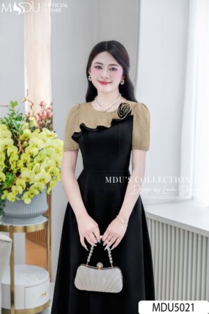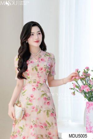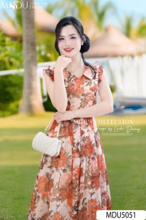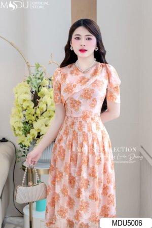 Váy Thiết Kế MDU5006 Tơ Ép Hoa Nổi Cam Đào Ngọt Ngào Vai Xếp Tầng Bất Đối Xứng Dáng Xòe Nhẹ