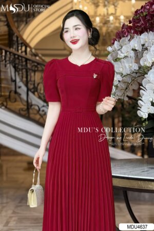 Váy Thiết Kế MDU4680 Màu Đỏ Xếp Ly Eo Hoa Đính Tinh Tế