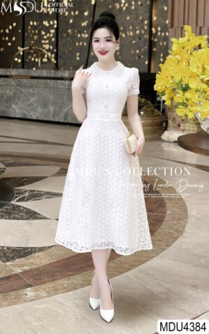 Váy Thiết Kế MDU4374 – Màu Trắng Tinh Khôi Cổ Tròn Họa Tiết Bắt Mắt Tạo Điểm Nhấn Cho Váy