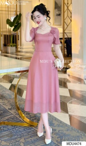 Váy Thiết Kế MDU4474 – Màu Hồng Nhẹ Nhàng Chiết Eo Tỉ Mỉ Dáng Xòe Nhẹ Đính Hoa Trước Ngực Quyến Rũ