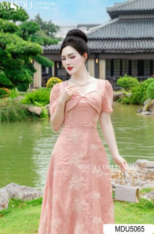 Váy Thiết Kế MDU5065 Tơ Nhăn Hồng Nhạt Thêu Hoa Trắng Dài Xòe Cổ Vuông Tay Bồng Nơ To Ngực Nữ Tính Và Bay Bổng