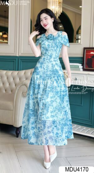 Váy Thiết Kế MDU4170 Dáng Tiểu Thư Trễ Vai Hoạ Tiết Hoa Xanh Mix Hoa Đính Ngực Thanh Lịch