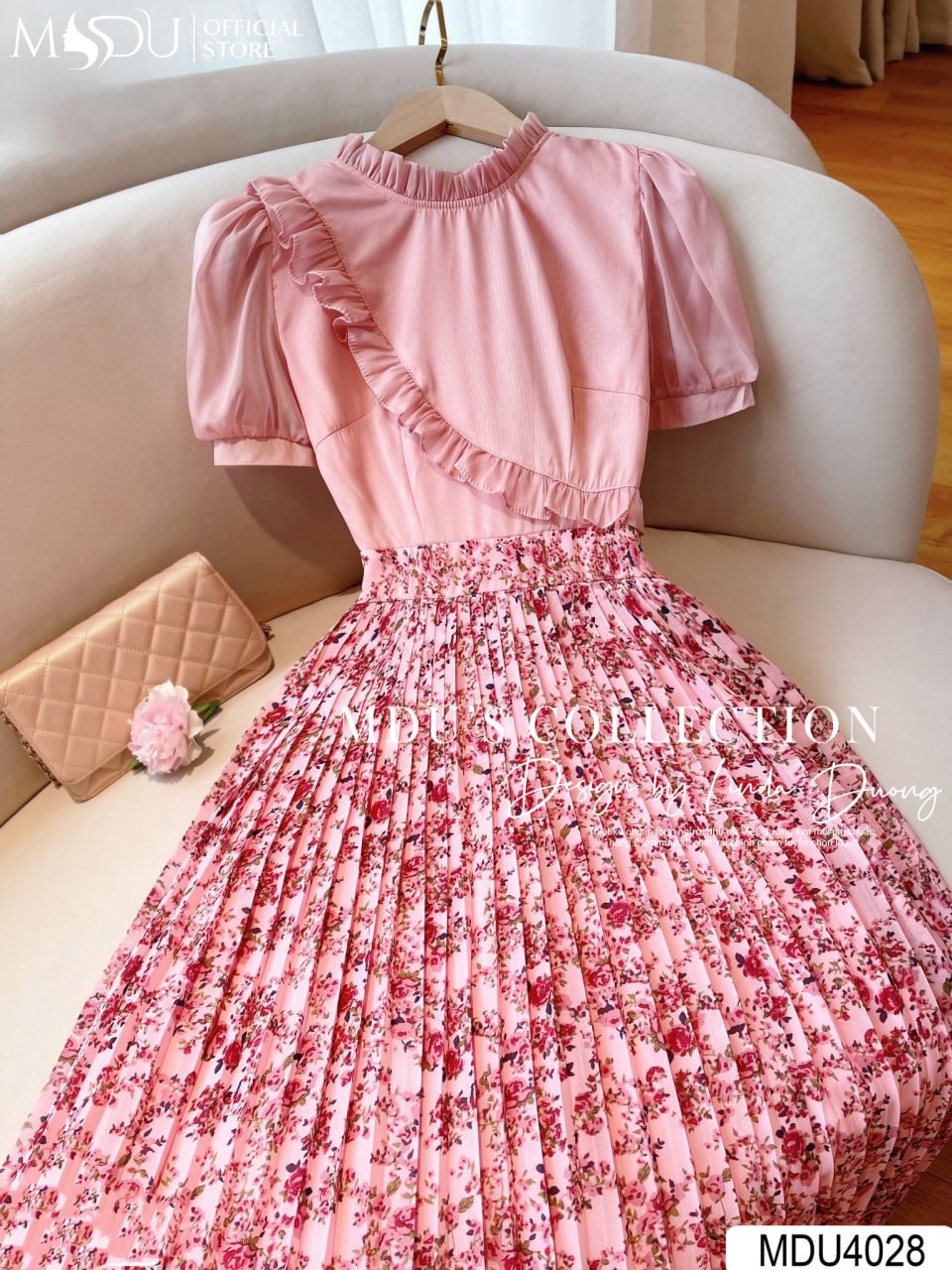Váy Thiết Kế MDU4028 – Sự Kết Hợp Tinh Tế Giữa Màu Hồng Nhạt Dịu Dàng Và Chất Liệu Tơ Óng Chính Phẩm Loại 1