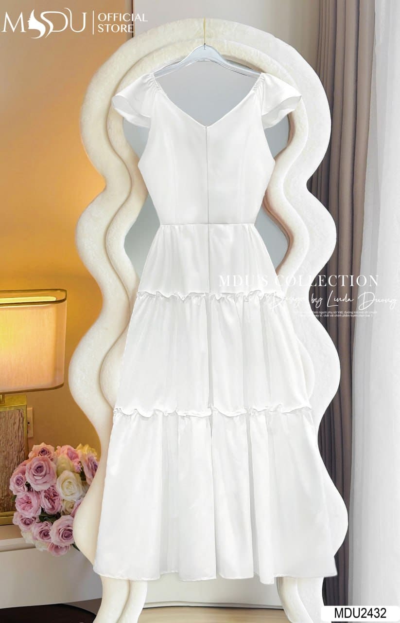 Váy Thiết Kế MDU2432 Vải Thô Trắng Dài Xòe Suông Tầng Cổ V Sâu Tay Cánh Tiên Thanh Thoát