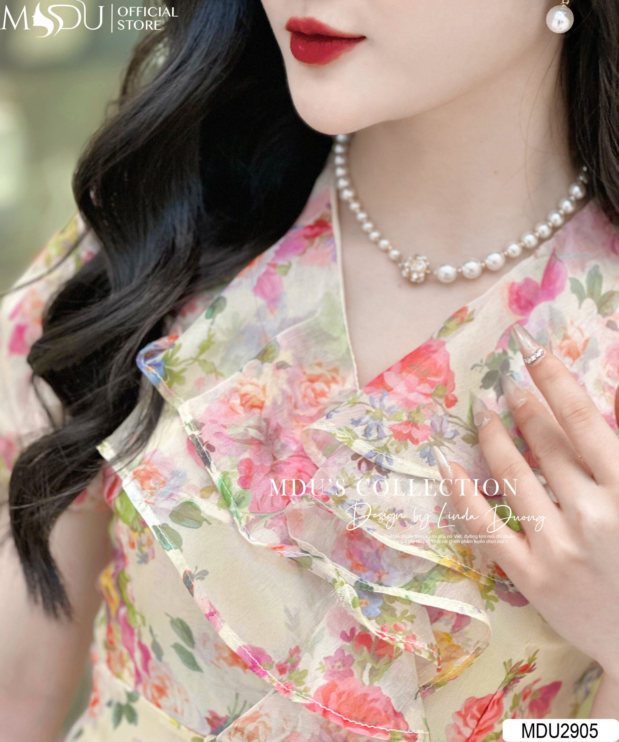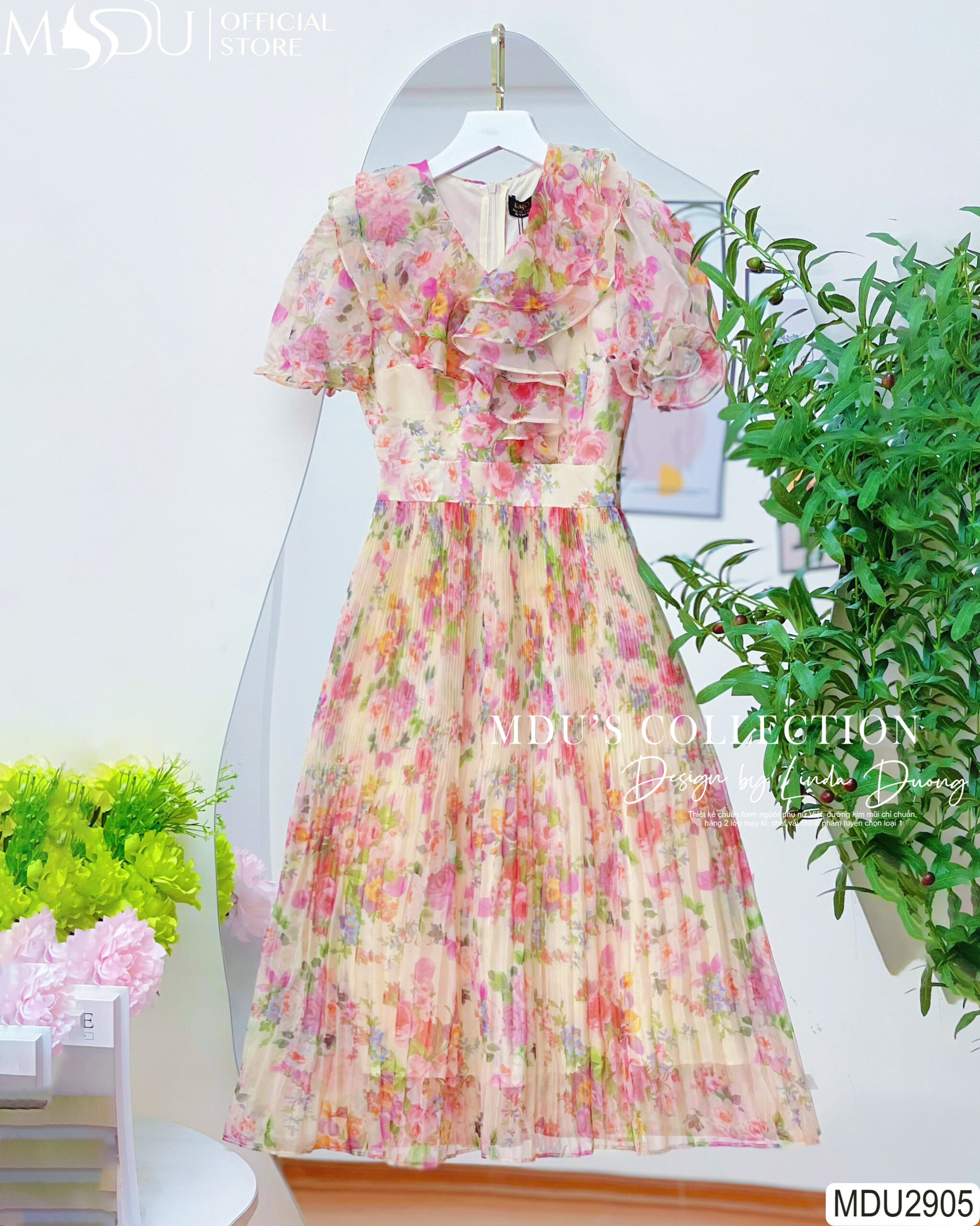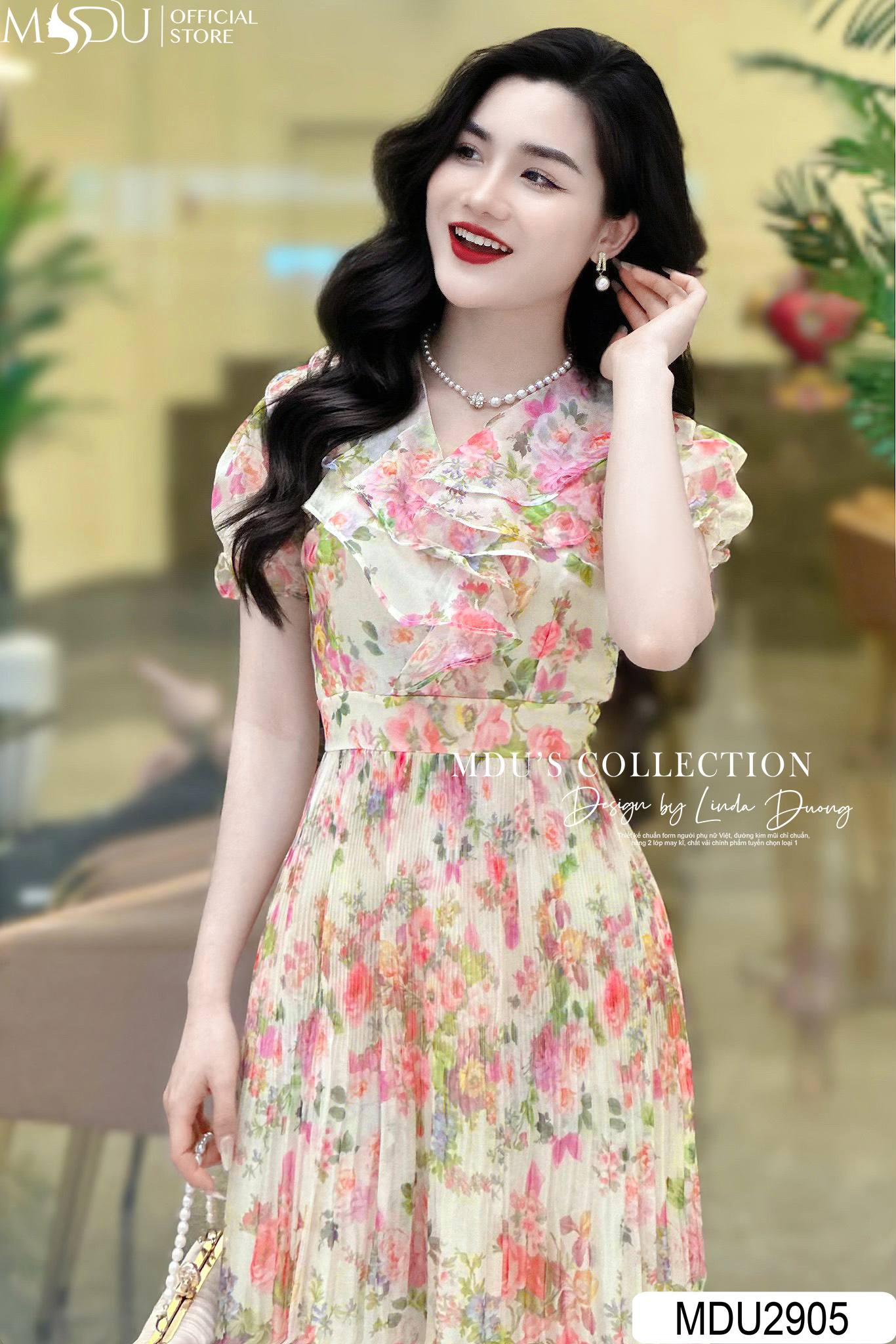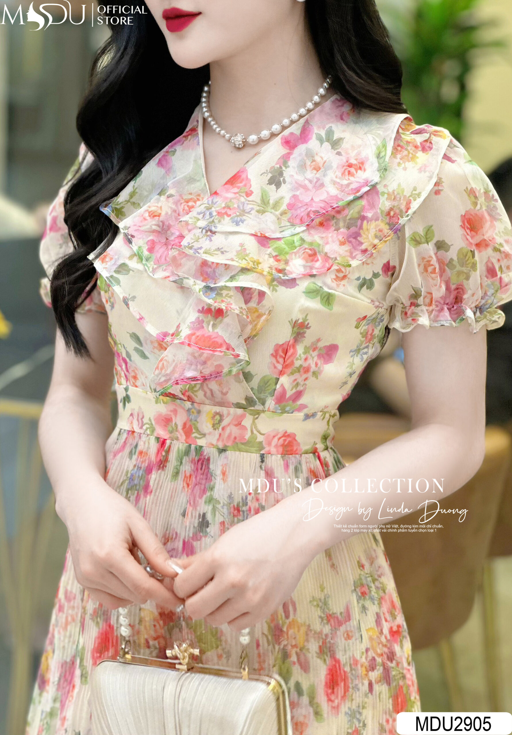 MDU2905 nổi bật với thiết kế cổ bèo và họa tiết hoa cực kỳ tiểu thư, tạo vẻ đẹp thanh lịch và quyến rũ. Thiết kế dáng xòe nhẹ nhàng mang đến sự nữ tính và duyên dáng. Khóa sau được giấu kín, cùng với các đường may cẩn thận, tạo nên sự tinh tế và sang trọng. Chiếc váy này không chỉ thích hợp cho các buổi tiệc mà còn phù hợp khi đi công sở hay dạo phố, đảm bảo tính ứng dụng cao và không bao giờ lỗi mốt.