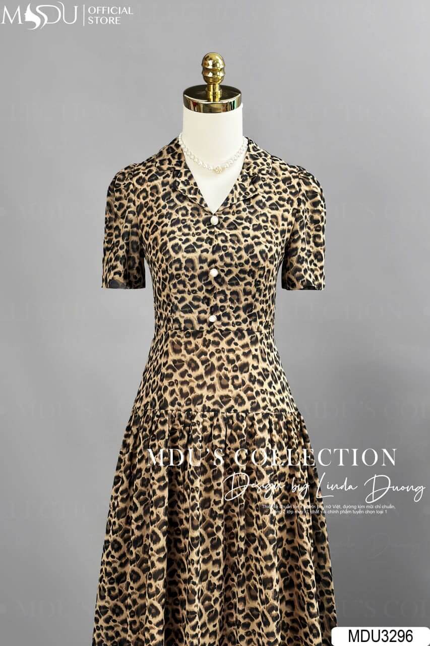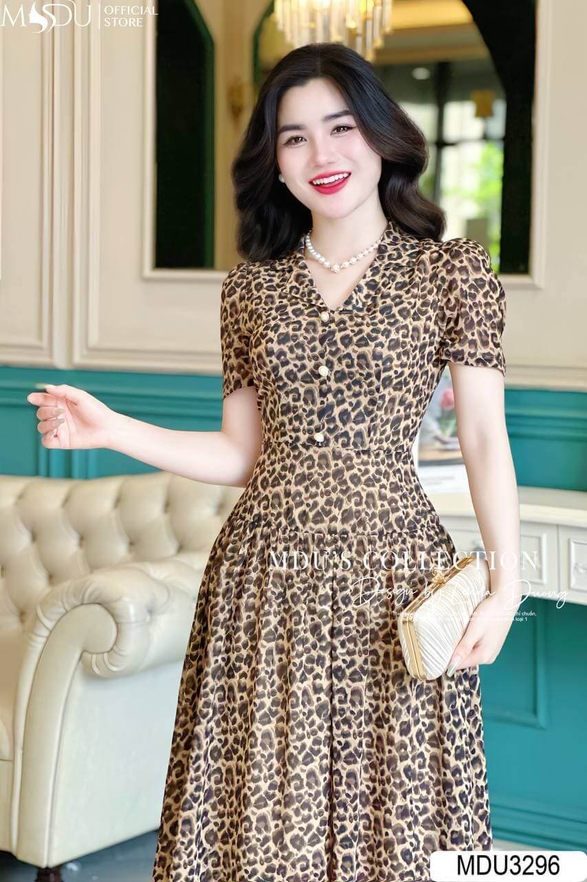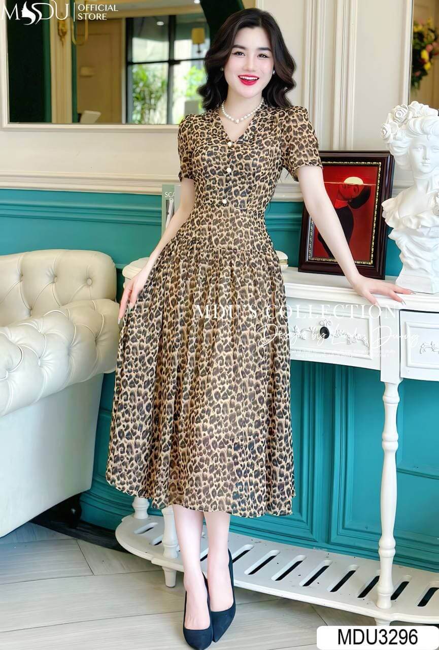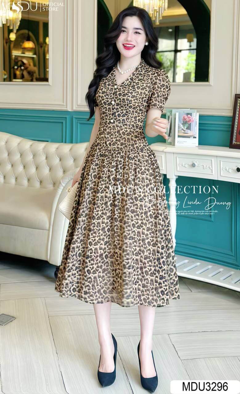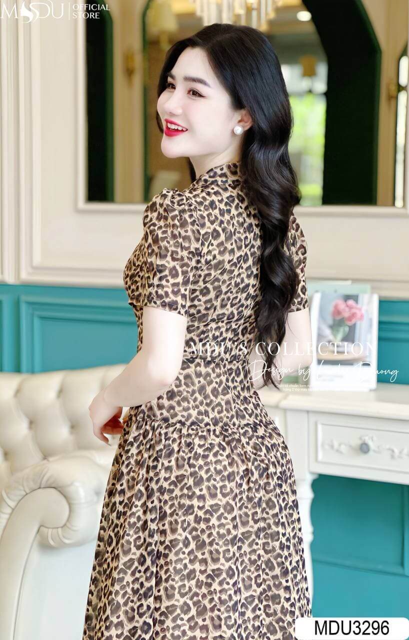 Váy có thiết kế dáng xòe nhẹ, phần eo được chiết khéo léo giúp tôn lên vòng eo thon gọn của phái đẹp. Họa tiết da báo trên nền vải tạo nên vẻ ngoài mạnh mẽ nhưng không kém phần quyến rũ. Chiều dài váy vừa phải, phù hợp cho nhiều dịp khác nhau, từ dạo phố đến những buổi tiệc sang trọng.