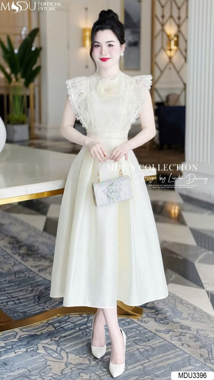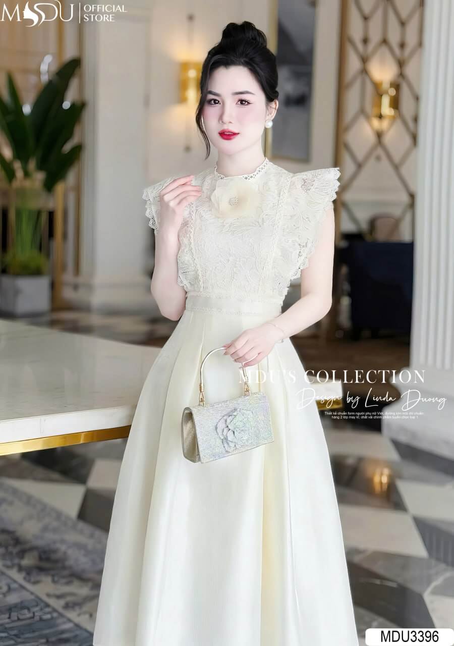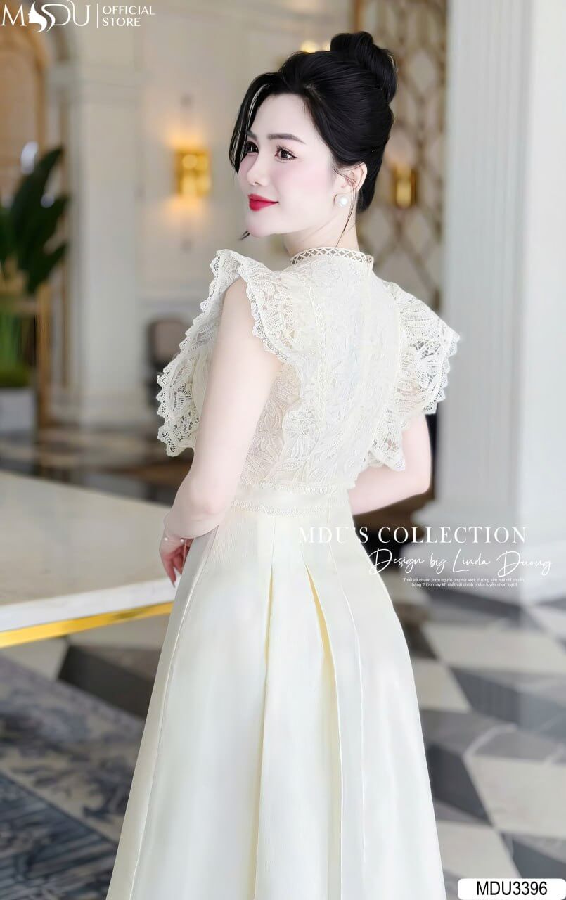 MDU3396 gây ấn tượng với phần thân trên được chế tác từ chất ren dệt họa tiết cao cấp, màu trắng kem thanh lịch. Chất liệu ren mềm mại, thoáng khí, và tinh xảo trong từng đường nét, mang lại vẻ đẹp sang trọng và đẳng cấp. Kết hợp cùng thiết kế chỉn chu và sự chăm chút trong từng chi tiết, chiếc váy tôn lên dáng vẻ mềm mại, uyển chuyển và phong cách thời trang tinh tế.