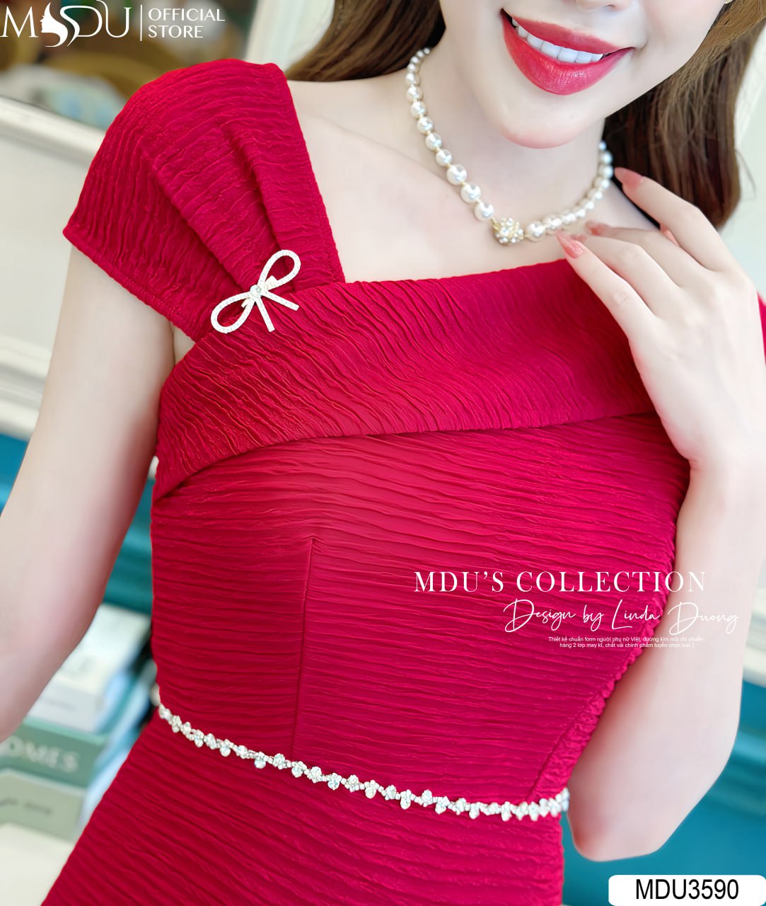 Váy sở hữu thiết kế độc đáo với điểm nhấn nổi bật là chi tiết cài ngọc nơ tinh tế ở phần vai, tạo nên vẻ đẹp quyến rũ và thanh lịch. Kết hợp cùng chi tiết đính đá tỉ mỉ ở phần eo, váy đầm MDU3590 không chỉ tôn lên vòng eo thon gọn mà còn tạo điểm nhấn cho toàn bộ trang phục. Váy được thiết kế hai lớp dày dặn, không hở lộ, thích hợp cho nhiều dịp như đi làm, du lịch, đi chơi và các buổi tiệc.