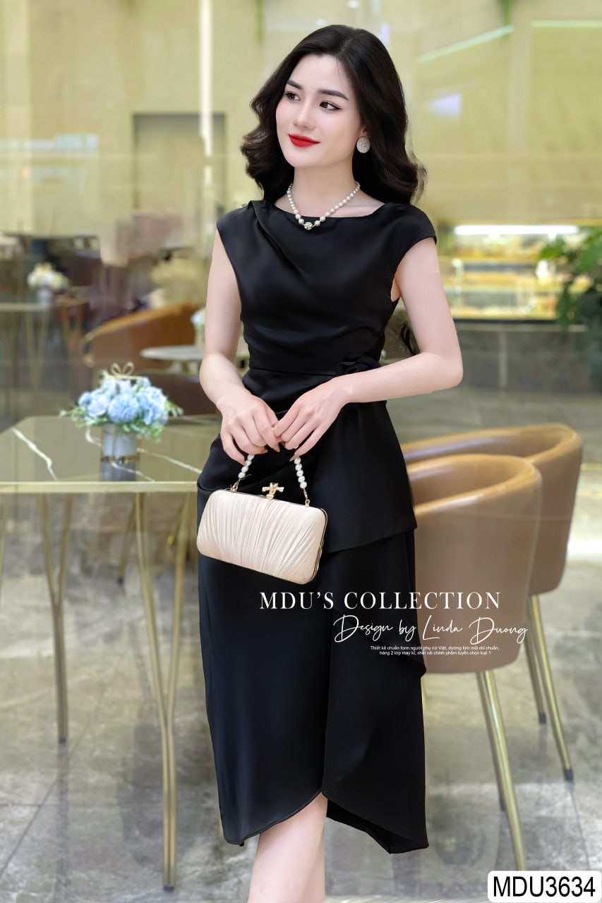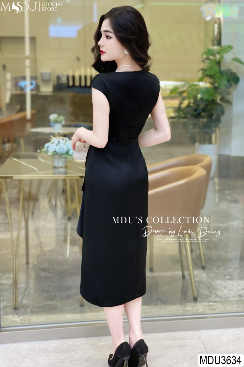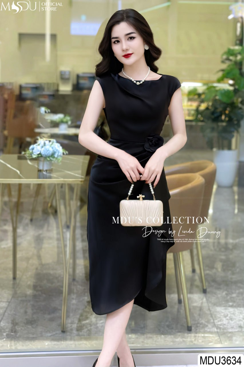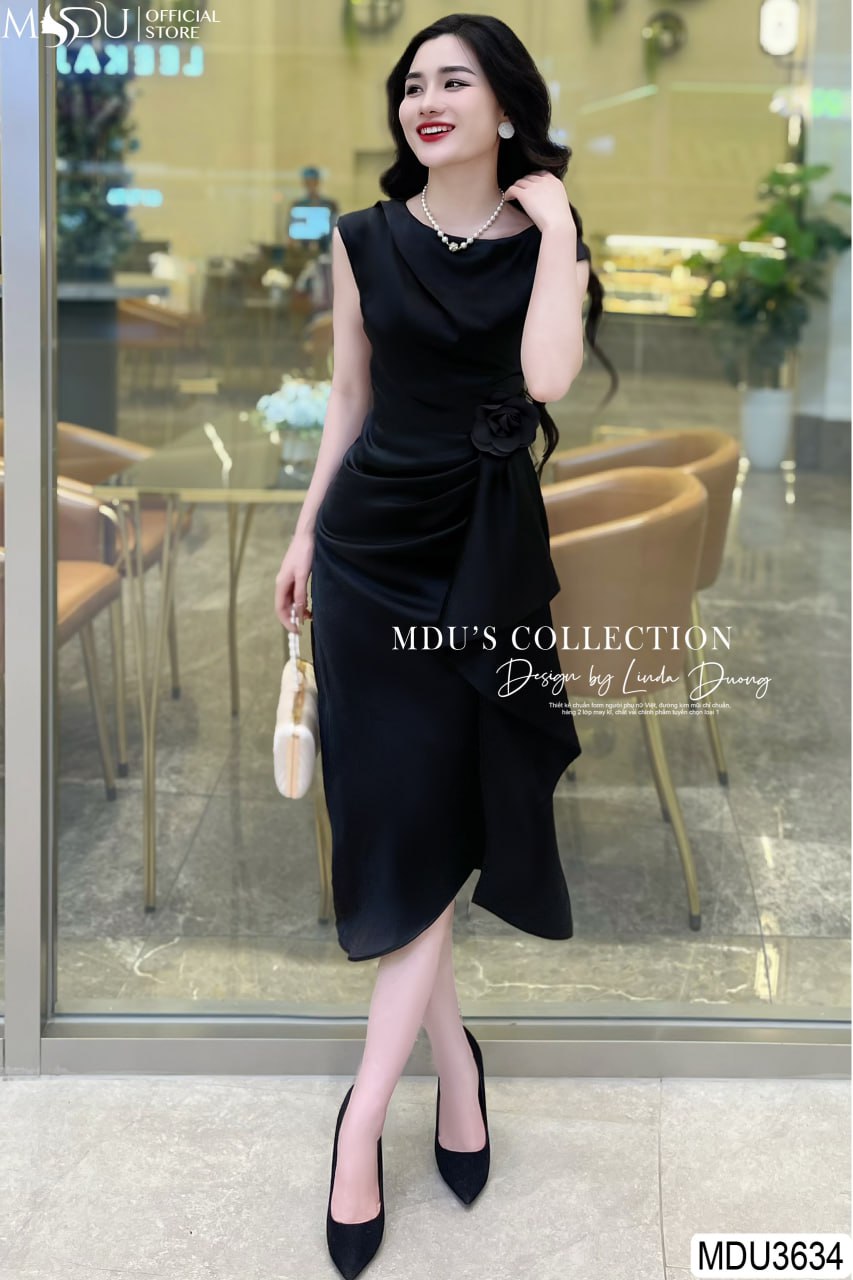 MDU3634 nổi bật với tông màu đen huyền bí, thiết kế hoa đính rời eo tinh tế, tạo nên sự quyến rũ và thanh lịch. Chi tiết ly eo được chăm chút kỹ lưỡng, giúp che khuyết điểm vòng 2 và tôn lên vòng 3 của các nàng. Váy được thiết kế 2 lớp dày dặn, không hở lộ, khóa bọc và dấu đường may cẩn thận, đảm bảo sự kín đáo và thoải mái khi mặc.