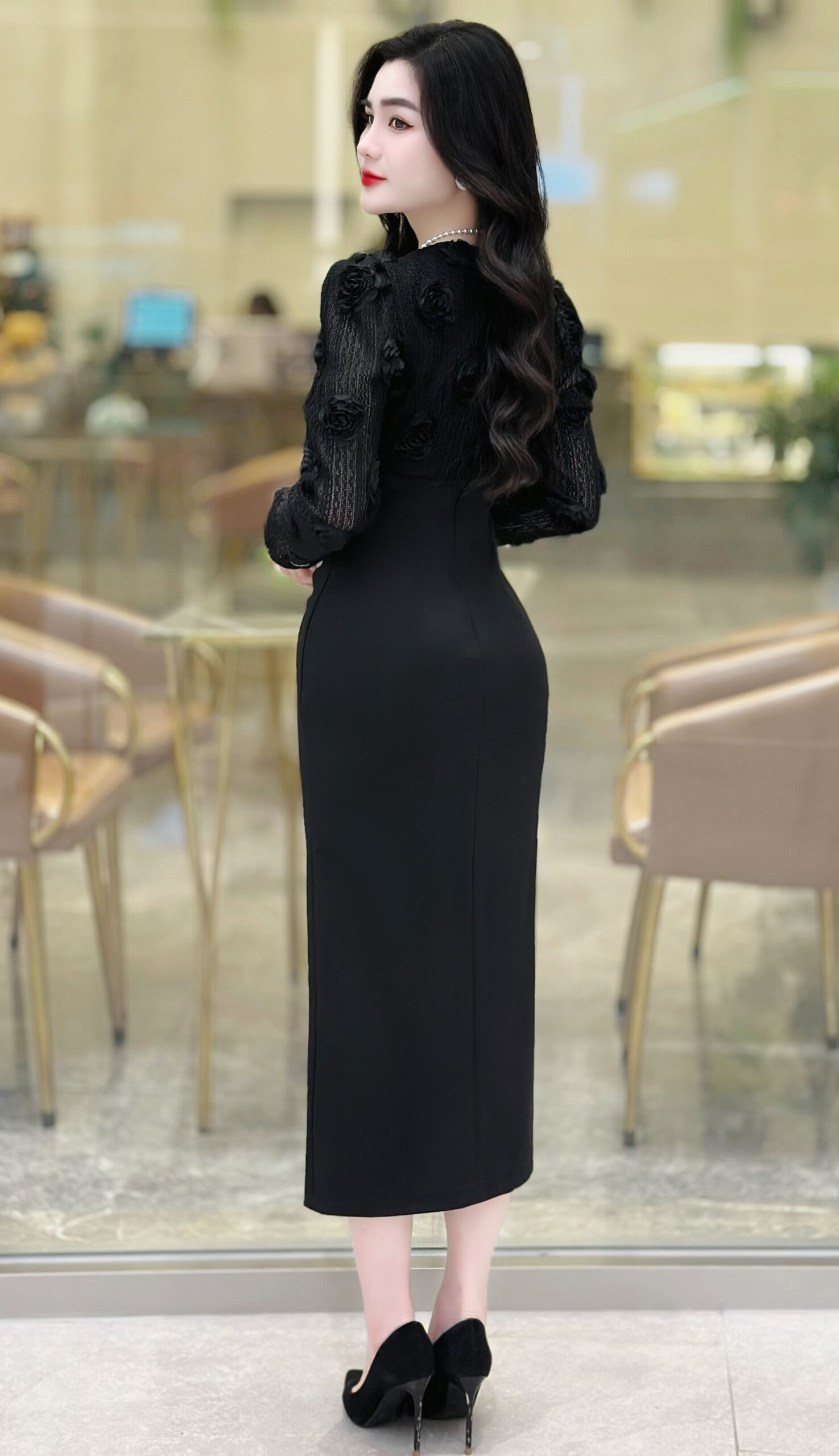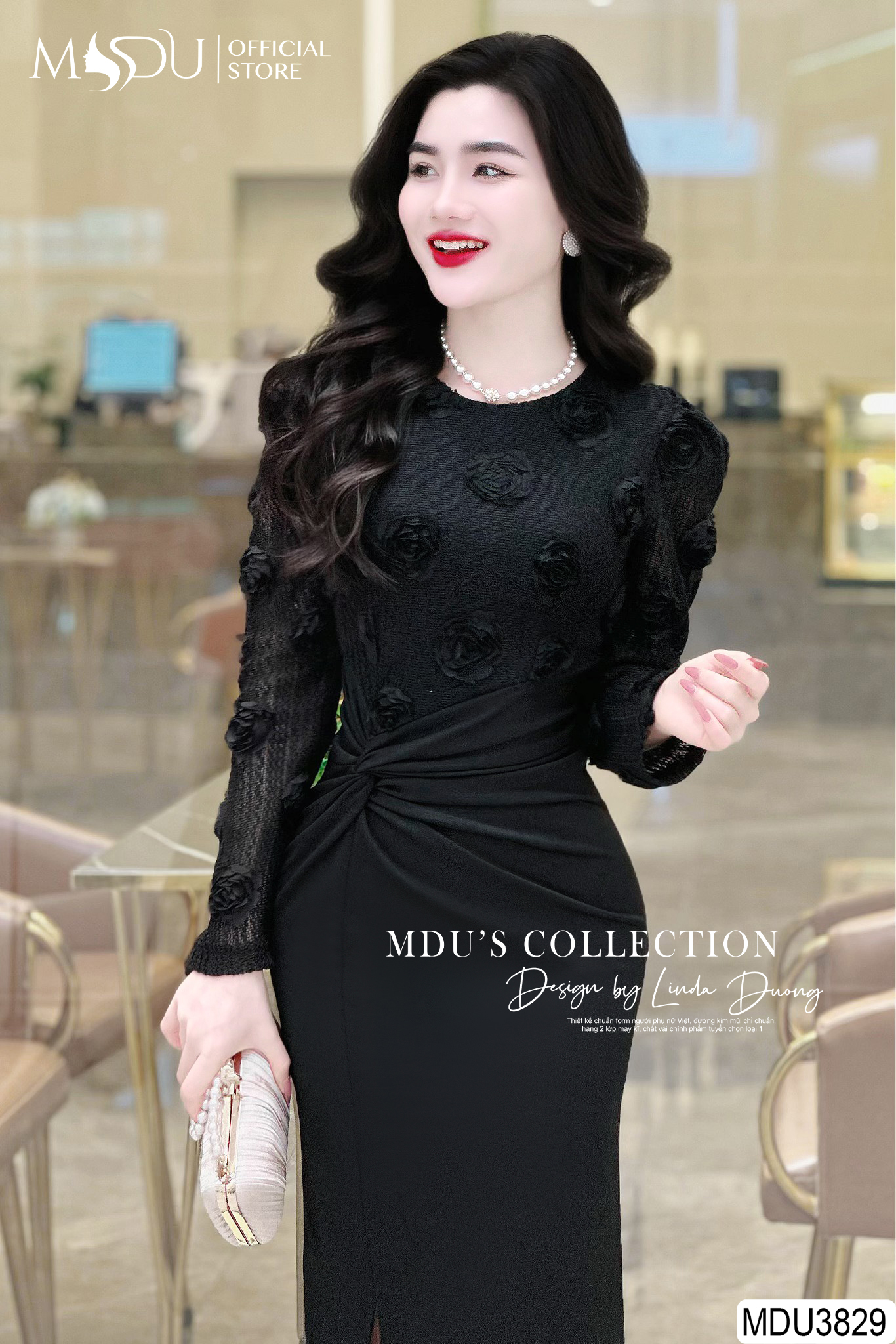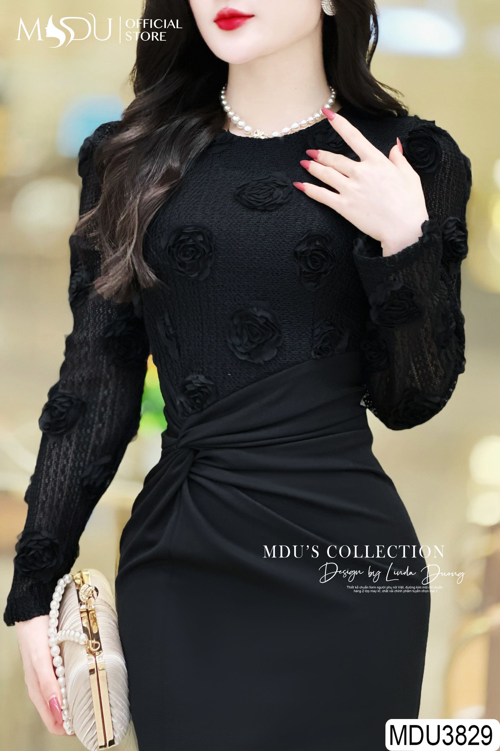MDU3829 nổi bật với thiết kế tông màu đen dài tay ôm body, tạo nên vẻ đẹp sang trọng và quyến rũ. Họa tiết hoa thêu tay tỉ mỉ mang lại điểm nhấn nổi bật, cùng với đường xẻ trước tinh tế, giúp tôn lên đường cong cơ thể và tạo nên phong cách thanh lịch. Chiếc váy này không chỉ thích hợp cho các buổi tiệc mà còn phù hợp khi đi công sở hay dạo phố, đảm bảo tính ứng dụng cao và không bao giờ lỗi mốt.