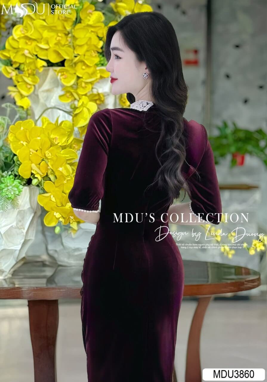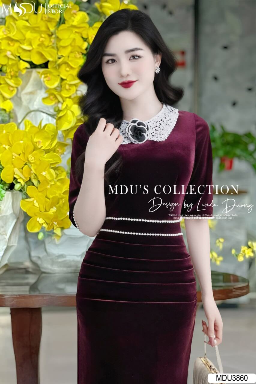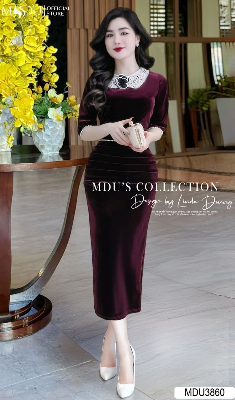 Váy Thiết Kế MDU3860 – Nhung Hàn Cao Cấp, Sắc Đỏ Rượu Vang Cuốn Hút