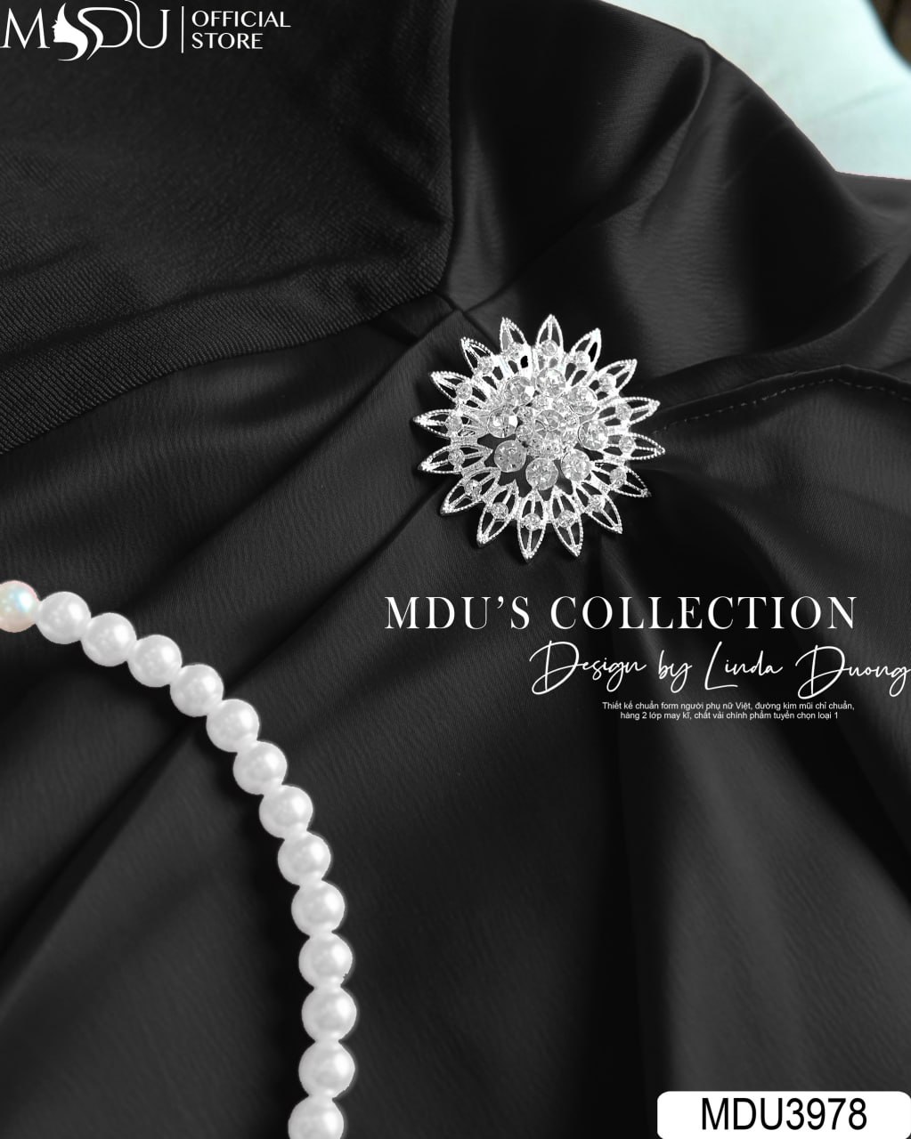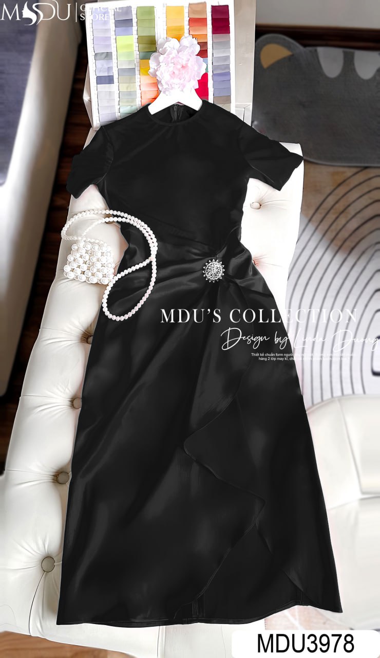 MDU3978 nổi bật với thiết kế xếp li che bụng cực tốt, giúp tôn lên đường cong cơ thể và che khuyết điểm một cách hiệu quả. Phần cổ đan chéo tạo điểm nhấn quyến rũ và sang trọng. Màu đen bóng cuốn hút cùng với ghim kim loại tháo rời tạo nên vẻ ngoài thanh lịch và đẳng cấp. Đuôi váy xẻ trước mang lại vẻ đẹp quyến rũ, thích hợp cho các buổi tiệc, đi công sở hay dạo phố.