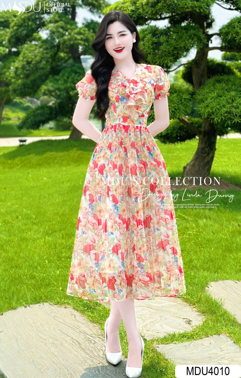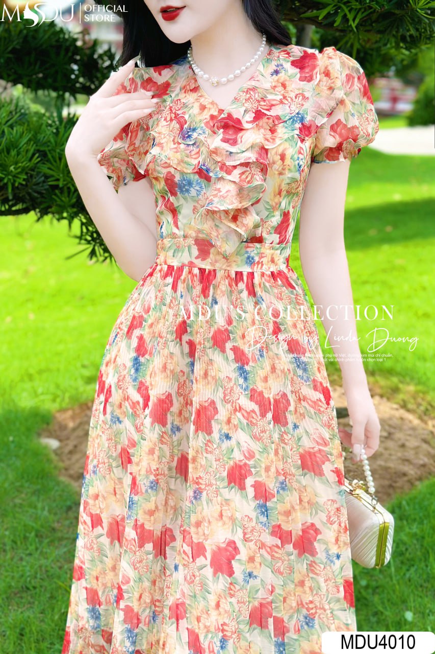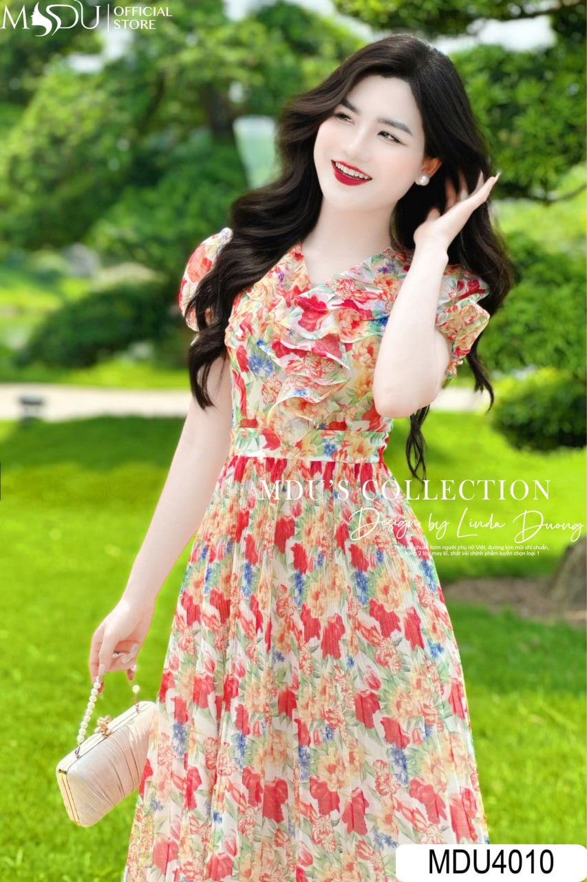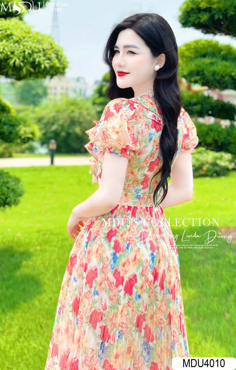 MDU4010 nổi bật với thiết kế dáng váy dài basic kết hợp nhiều đường xếp ly được may đo tỉ mỉ và tinh tế, tạo vẻ đẹp thanh lịch và quyến rũ. Họa tiết hoa bắt mắt trên gam màu tươi sáng, chi tiết cổ bèo và tay bo chun độc đáo tạo điểm nhấn cho toàn bộ thiết kế. Khóa kéo và đường may ẩn cẩn thận, tạo nên sự hoàn hảo và sang trọng. Chiếc váy này không chỉ thích hợp cho các buổi tiệc mà còn phù hợp khi đi chơi hay dạo phố, đảm bảo tính ứng dụng cao và không bao giờ lỗi mốt.