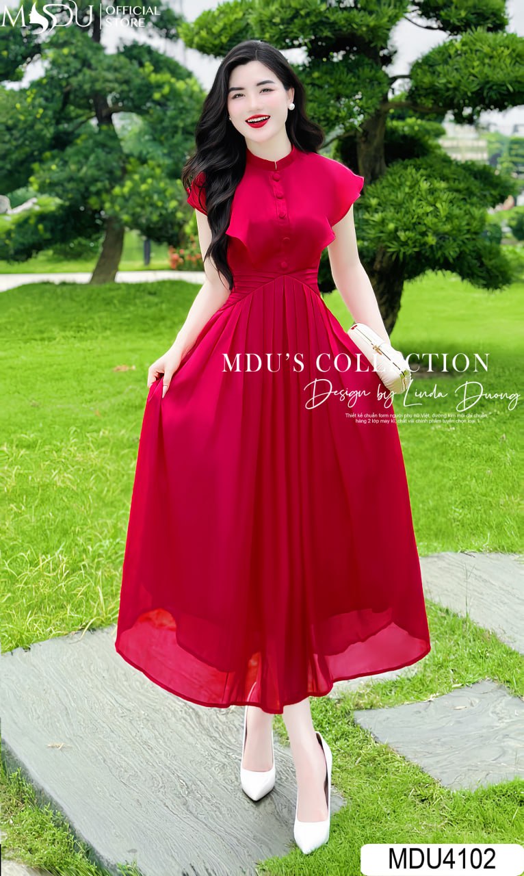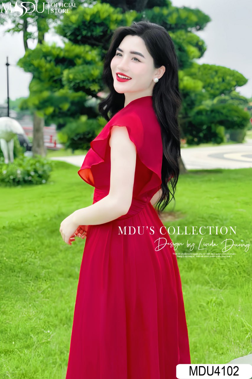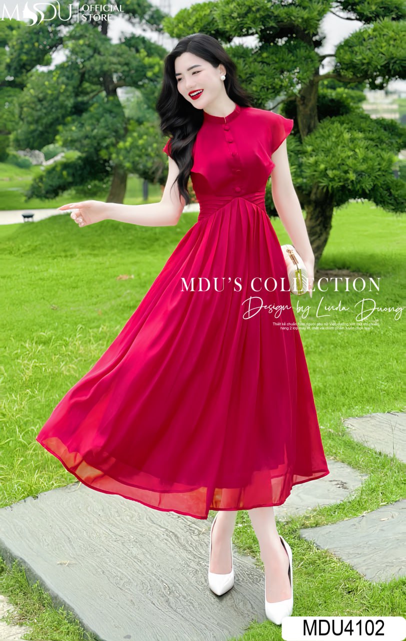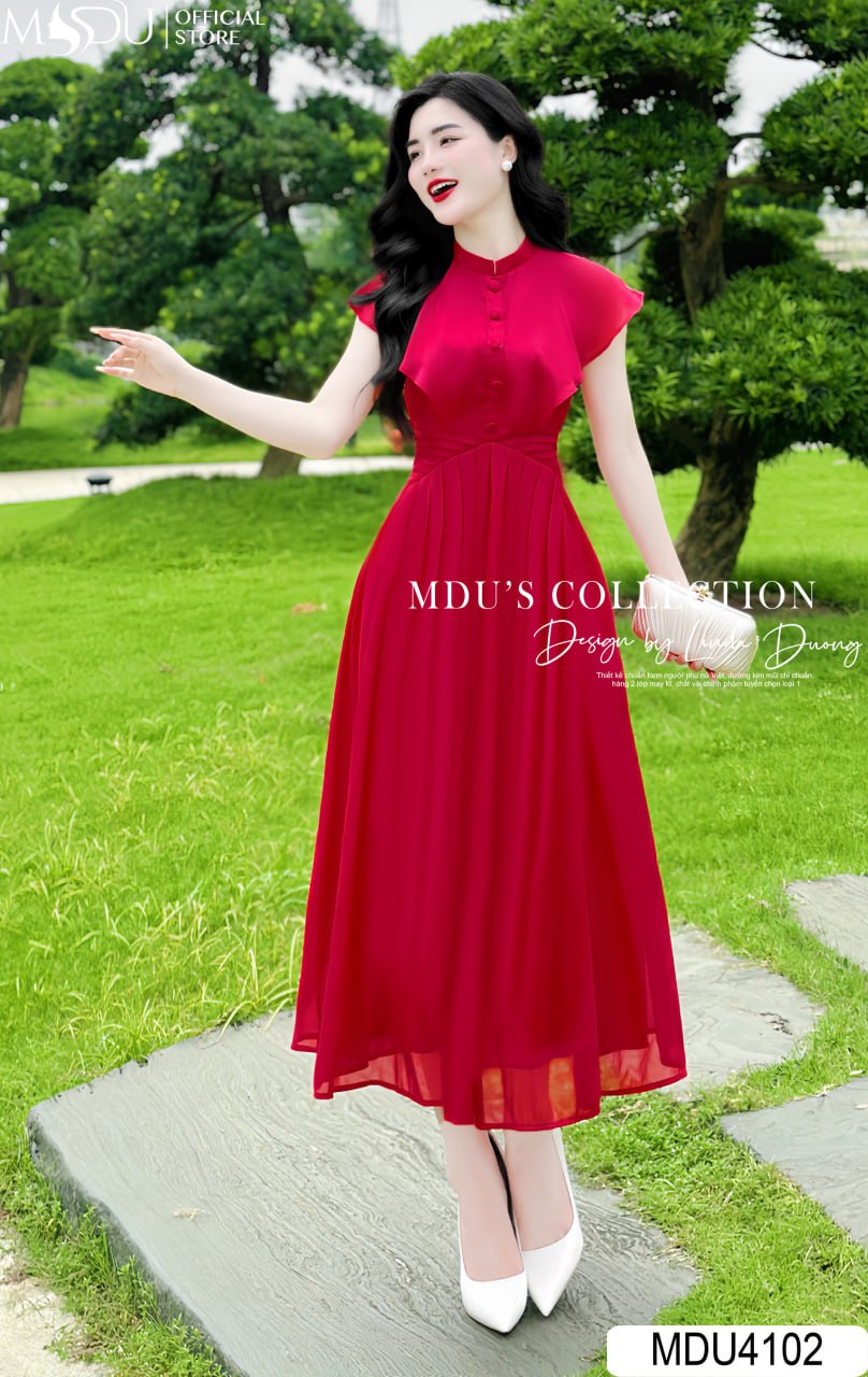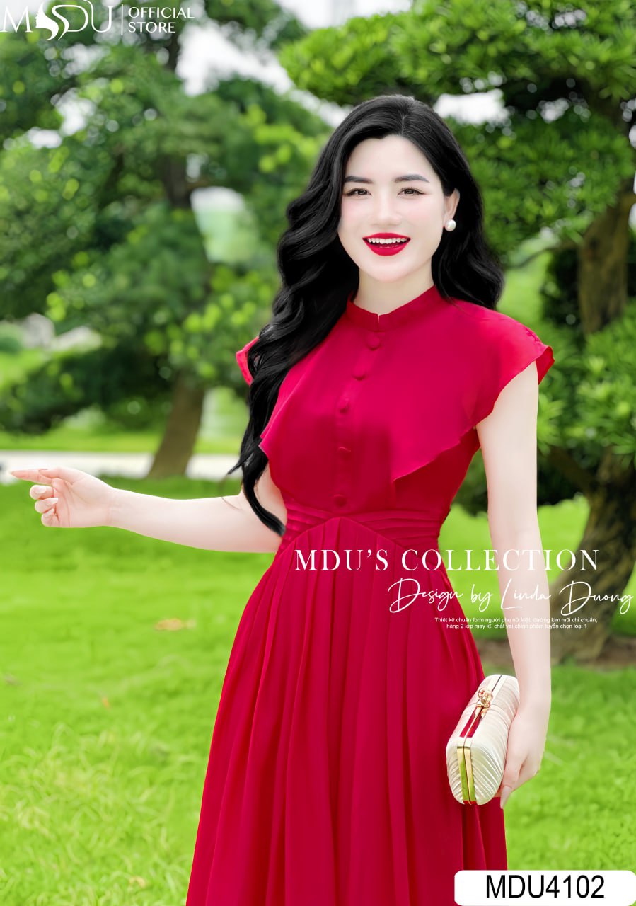 Váy Đầm Dáng Xoè MDU4102 – Tinh Tế và Sang Trọng Với Tông Đỏ Đậm và Thiết Kế Cánh Tiên