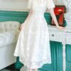 Váy sở hữu thiết kế cổ sơ mi thanh lịch cùng tay váy bồng cách điệu, mang lại vẻ đẹp duyên dáng và nữ tính. Hàng cúc ngọc đính tinh tế không chỉ làm tăng thêm sự sang trọng mà còn giúp tôn lên vẻ đẹp tuyệt hảo của người mặc. Váy được thiết kế hai lớp dày dặn, không hở lộ, với khóa và đường may được giấu cẩn thận, mang lại vẻ đẹp hoàn hảo và sự thoải mái khi mặc.