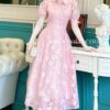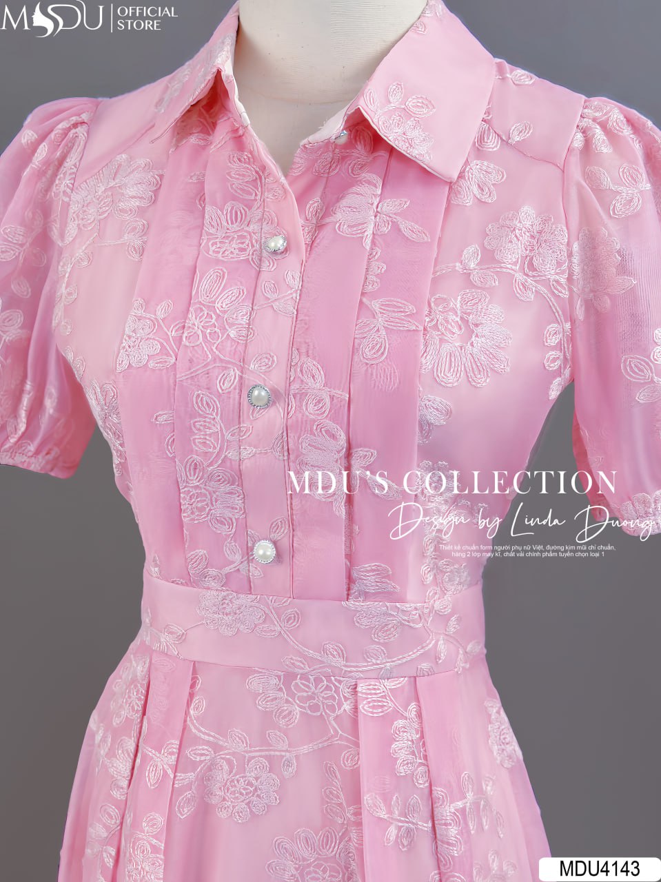 Thiết kế cổ sơ mi thanh lịch kết hợp với tay váy bồng cách điệu, cùng hàng cúc ngọc đính tinh tế, giúp tôn lên vẻ đẹp tuyệt hảo của người mặc. Gam màu hồng pastel nhẹ nhàng phối hợp với họa tiết thêu hoa bắt mắt, tạo nên sự cuốn hút khó cưỡng và phù hợp với nhiều phong cách khác nhau.