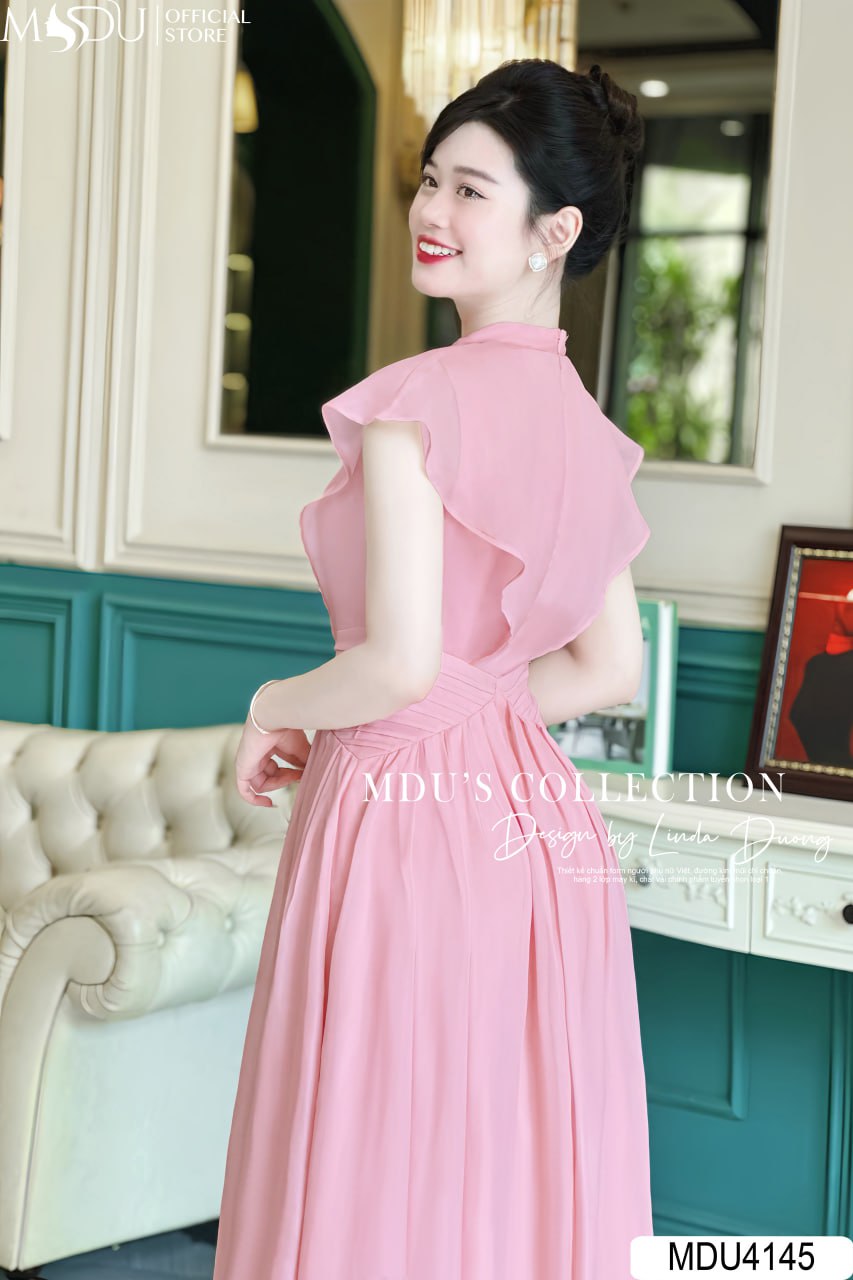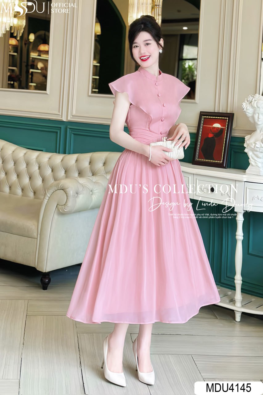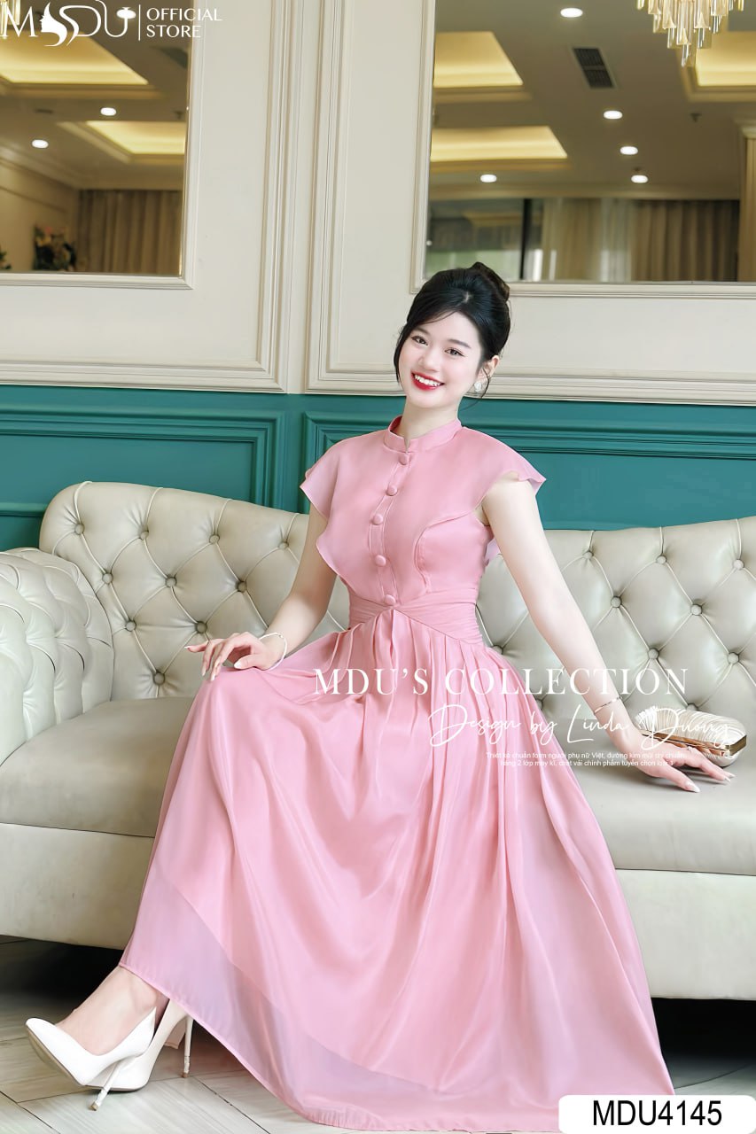 MDU4145 nổi bật với thiết kế cúc ngực và tay cánh tiên, tạo điểm nhấn tinh tế và cuốn hút. Phần eo được xếp ly khéo léo, giúp che bụng cực tốt và tôn lên vẻ đẹp thon gọn của người mặc. Chiếc váy này không chỉ thích hợp cho các buổi tiệc mà còn phù hợp khi đi chơi, đảm bảo tính ứng dụng cao và không bao giờ lỗi mốt. Với kỹ thuật làm hai lớp vải dày dặn, váy được bọc khóa và giấu đường may cẩn thận, 100% an toàn cho da và tạo cảm giác dễ chịu khi mặc.