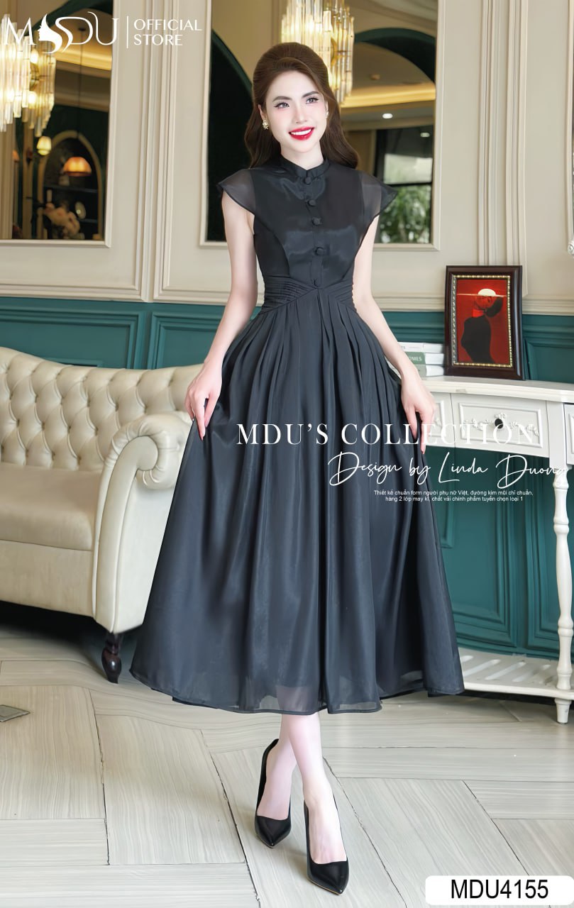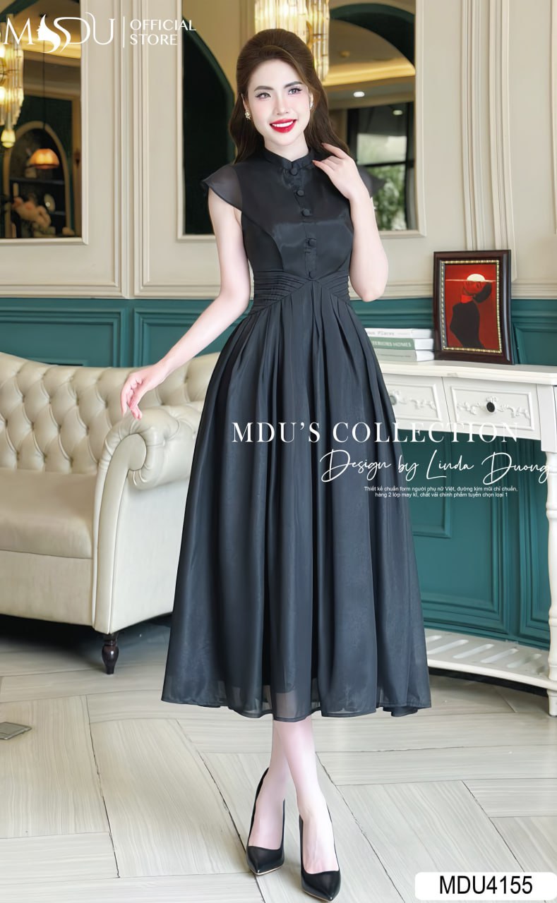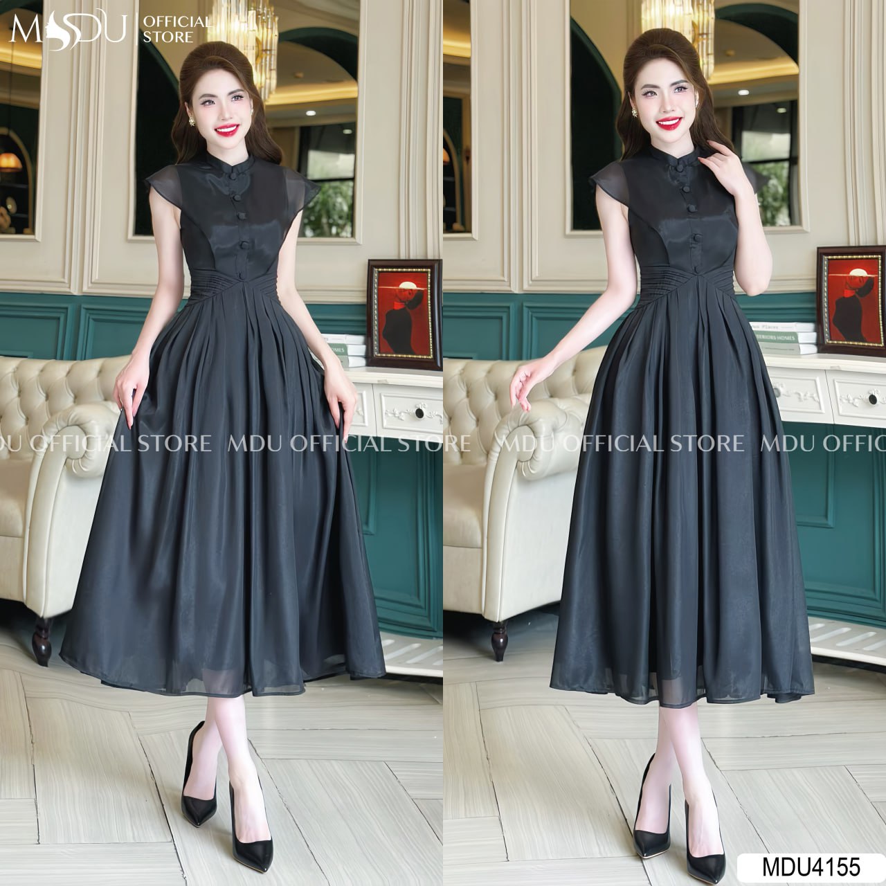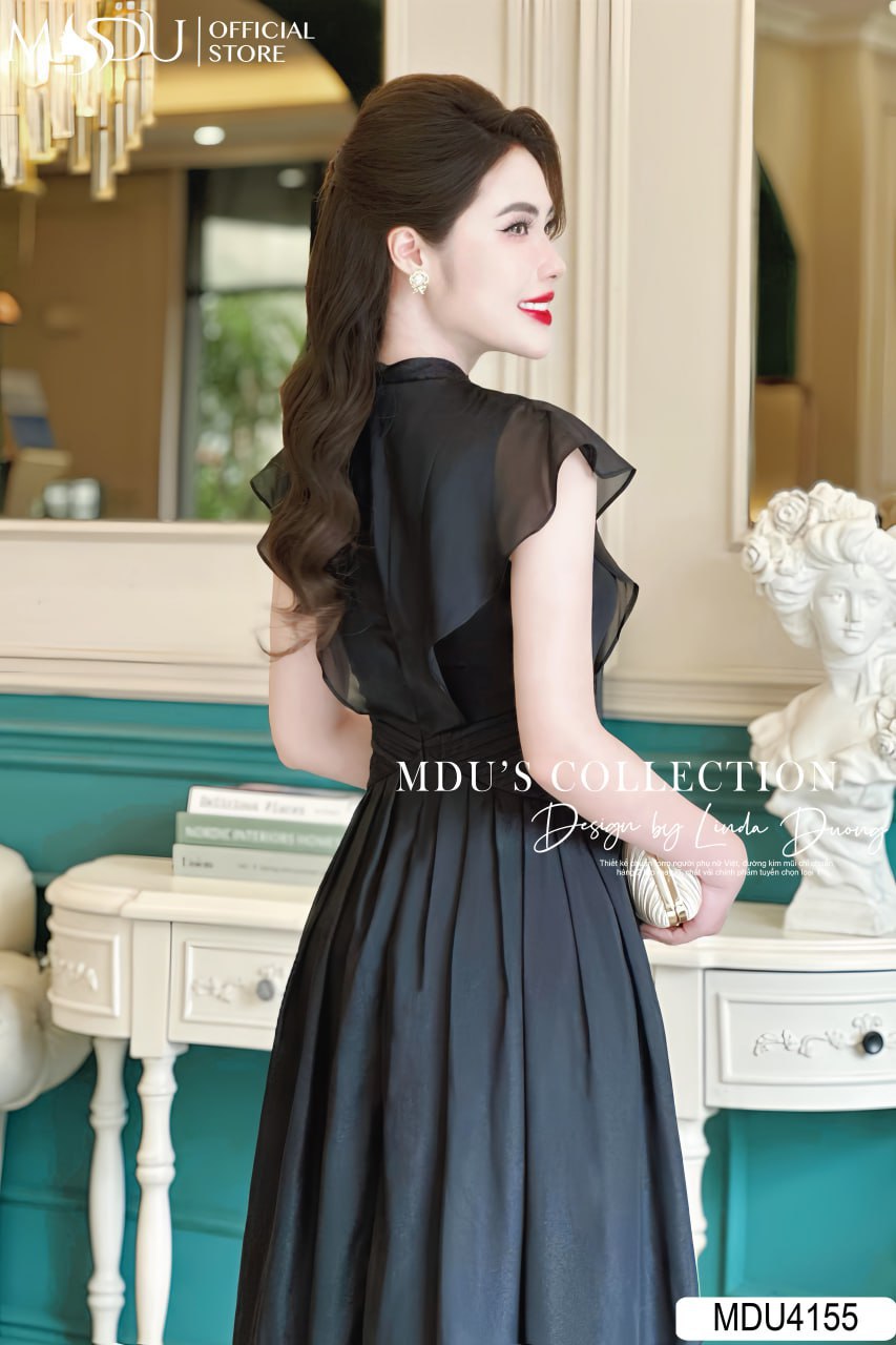 MDU4155 nổi bật với thiết kế cúc ngực và tay cánh tiên, tạo điểm nhấn tinh tế và cuốn hút. Phần eo được xếp ly khéo léo, giúp che bụng cực tốt và tôn lên vẻ đẹp thon gọn của người mặc. Chiếc váy này không chỉ thích hợp cho các buổi tiệc mà còn phù hợp khi đi chơi, đảm bảo tính ứng dụng cao và không bao giờ lỗi mốt. Với kỹ thuật làm hai lớp vải dày dặn, váy được bọc khóa và giấu đường may cẩn thận, 100% an toàn cho da và tạo cảm giác dễ chịu khi mặc.