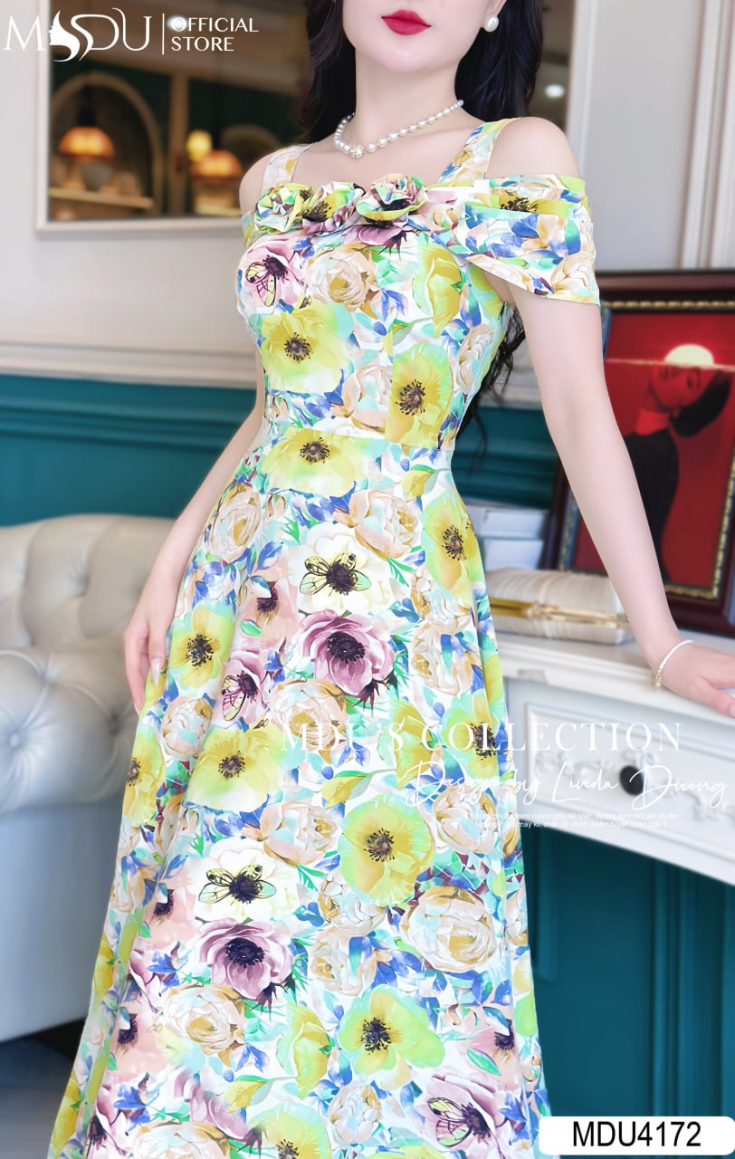 Váy có thiết kế xòe nhẹ nhàng, dáng trễ vai với họa tiết hoa bắt mắt, tạo nên vẻ đẹp thanh lịch và quyến rũ. Chiếc váy này không chỉ phù hợp cho nhiều dịp như đi tiệc, công sở hay dạo phố mà còn có tính ứng dụng cao và không bao giờ lỗi mốt. Mọi chi tiết như khóa và đường may đều được bọc cẩn thận, mang lại sự chắc chắn và bền đẹp.