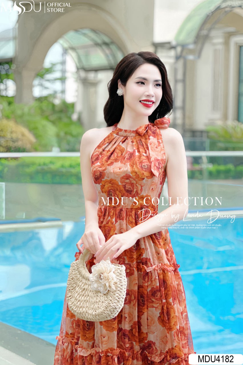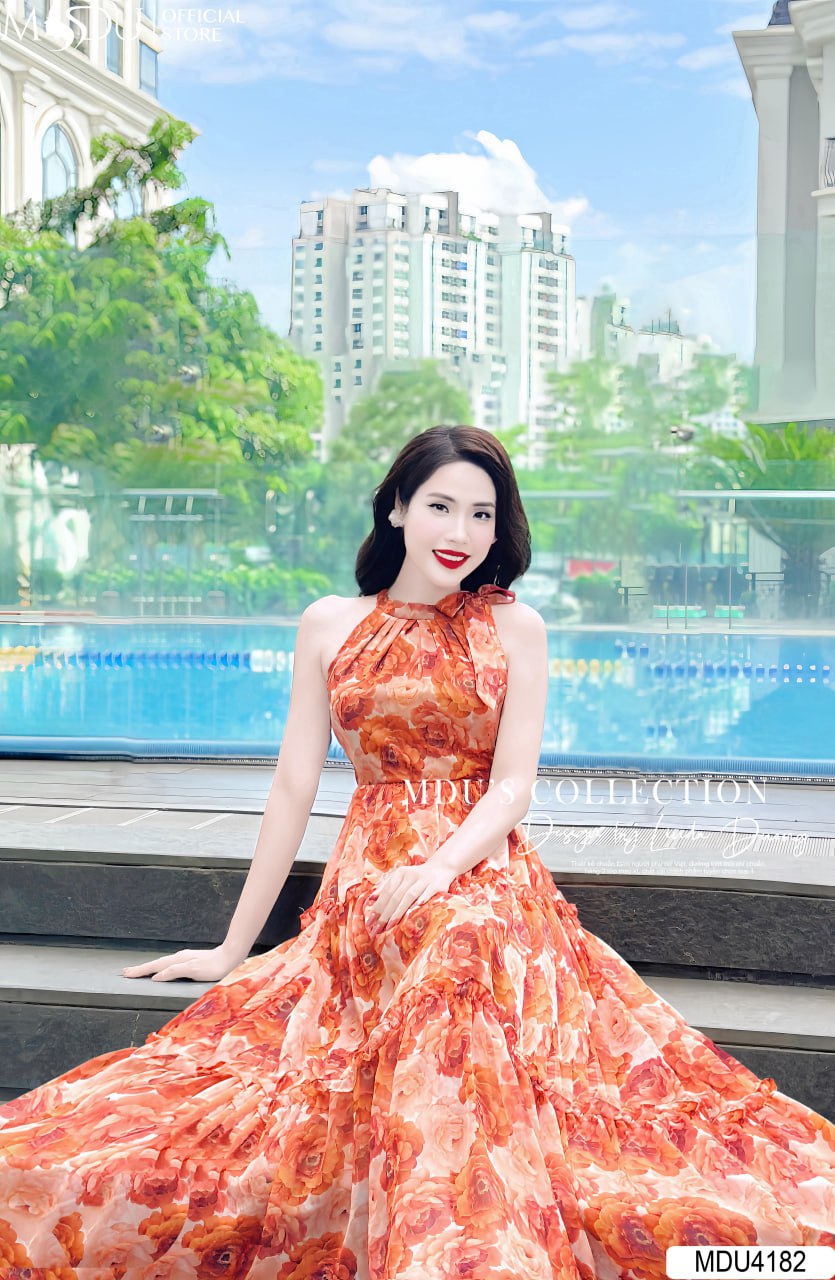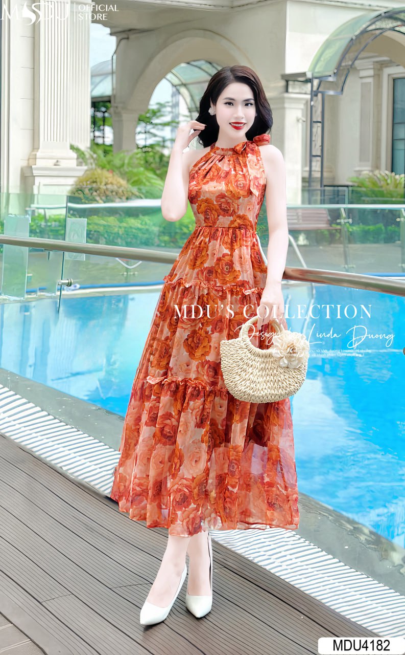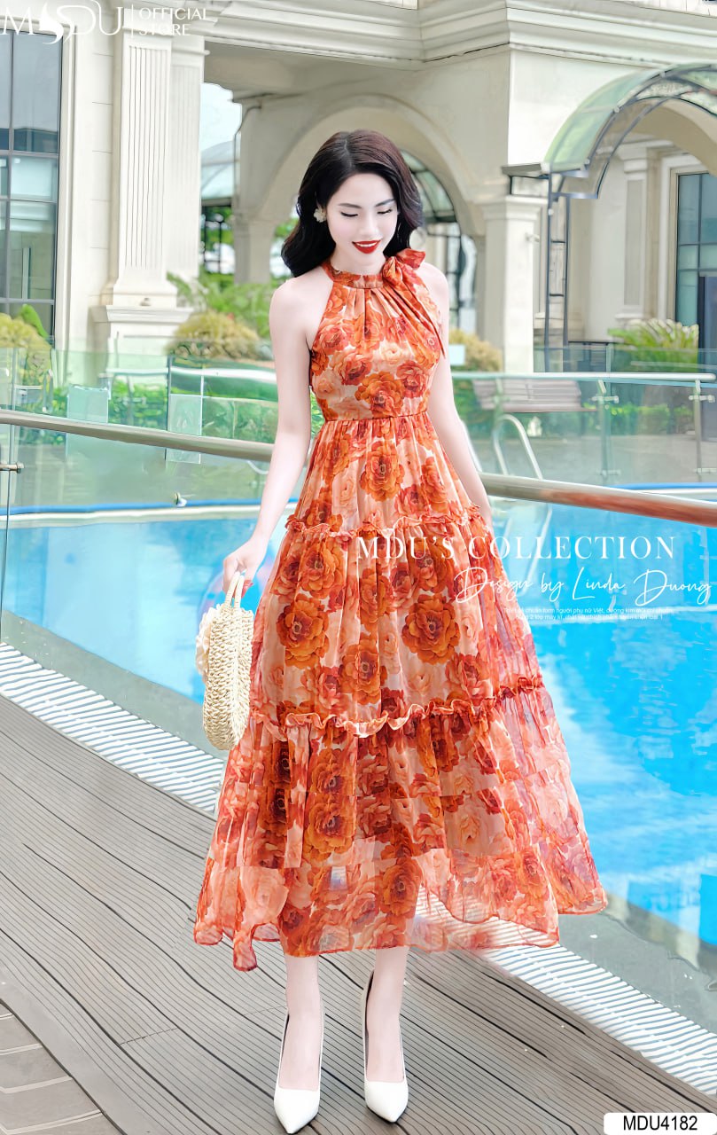Váy Đầm Đi Biển MDU4182 – Nổi Bật với Tông Cam và Họa Tiết Hoa Từ MDU Fashion