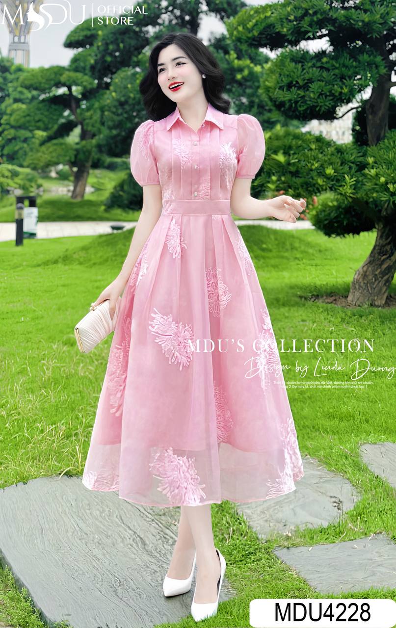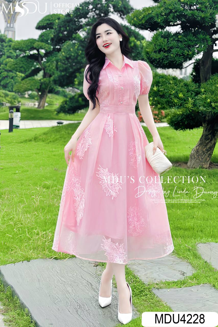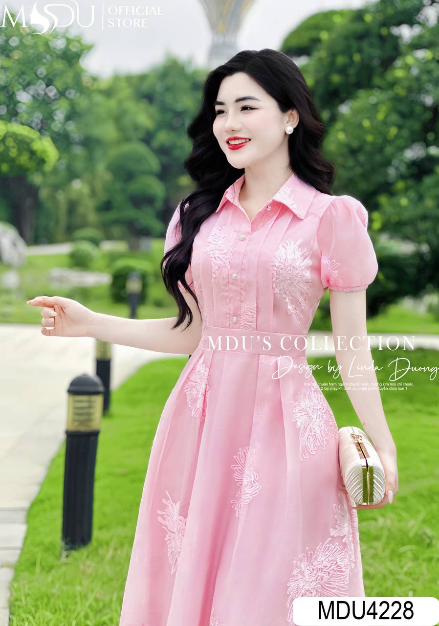 Váy Đầm Công Sở MDU4228 – Hồng Pastel Phối Hoạ Tiết, Cổ Sơ Mi Thanh Lịch Từ MDU fashion