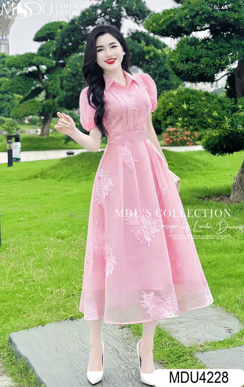 Thiết kế váy với gam màu hồng pastel dịu nhẹ, phối hoạ tiết thêu nổi bắt mắt, mang đến vẻ đẹp đầy nữ tính và quyến rũ. Cổ sơ mi thanh lịch kết hợp với tay váy bồng cách điệu và hàng cúc ngọc đính tinh tế giúp tôn lên vẻ đẹp tuyệt hảo của người mặc. Váy được thiết kế hai lớp dày dặn, không hở lộ, với khóa và đường may được giấu cẩn thận, mang lại cảm giác dễ chịu và thoải mái khi mặc.