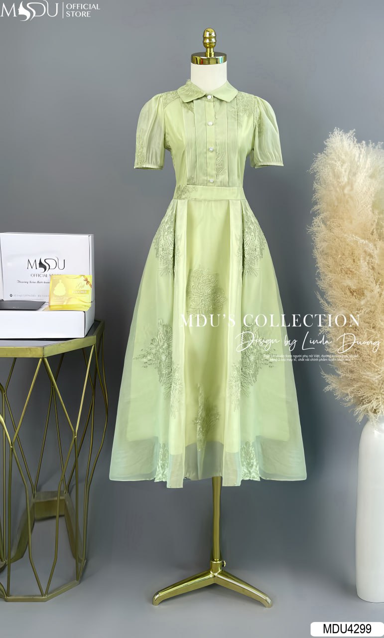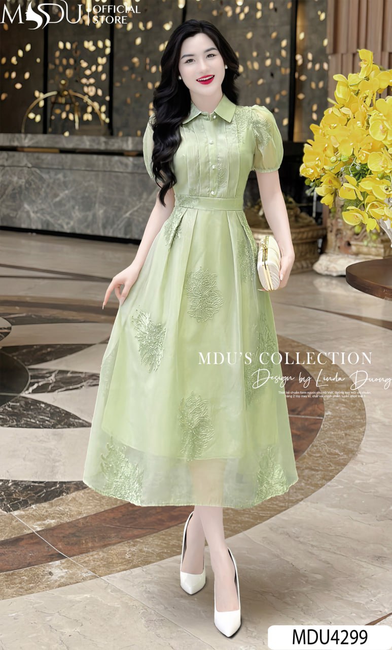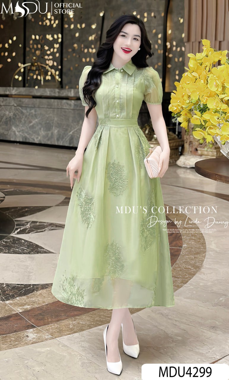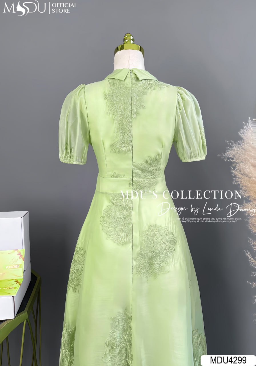 Váy Thiết Kế MDU4299 – Sự Kết Hợp Hoàn Hảo Giữa Màu Sắc Xanh Lá Và Chất Liệu Tơ Hoa Thêu Nổi Cao Cấp