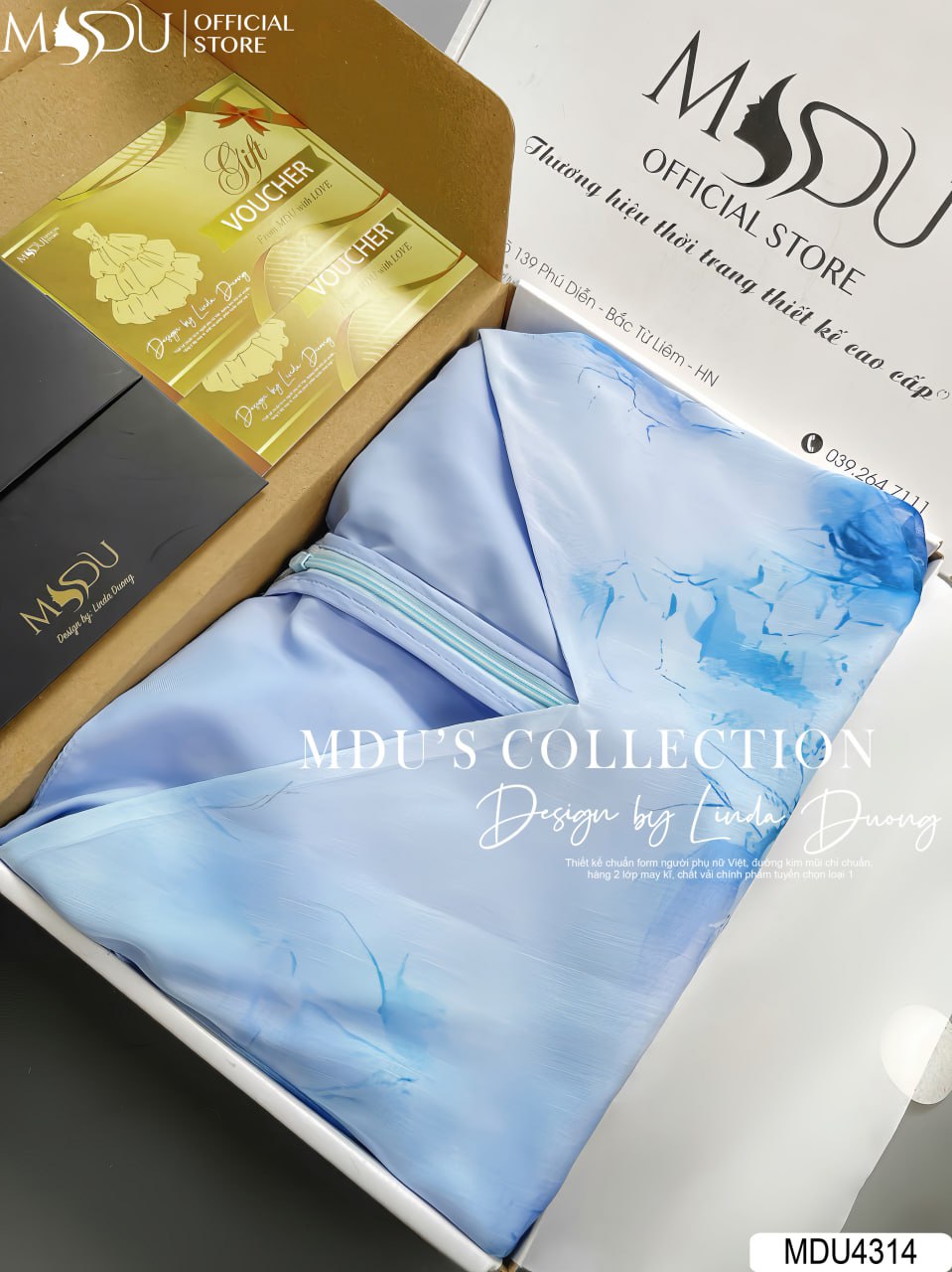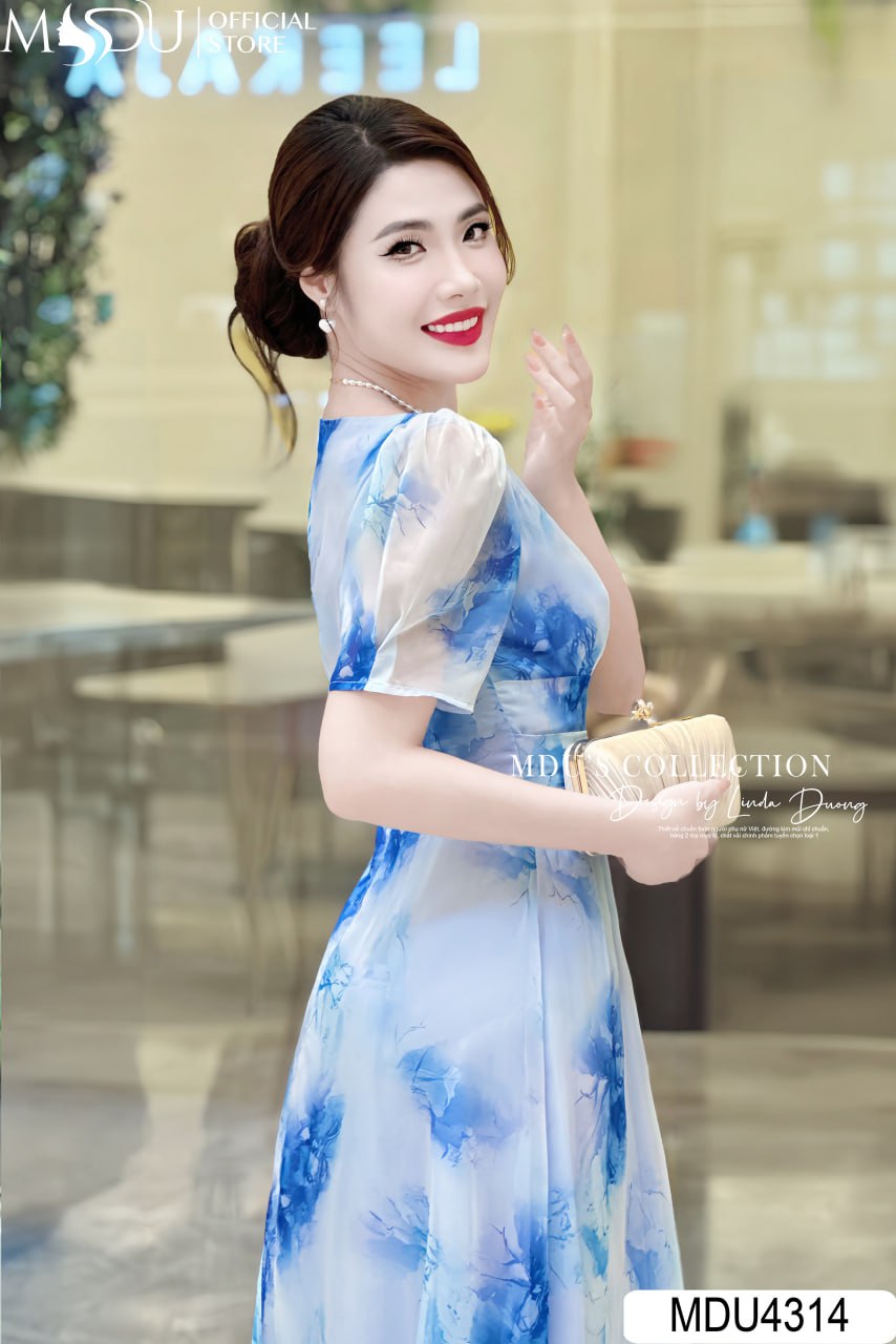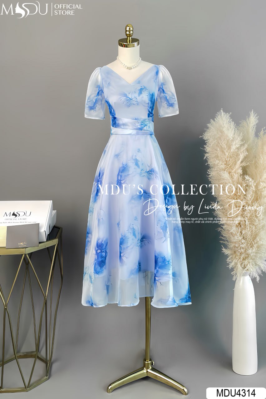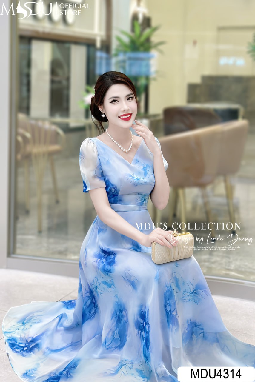 Váy Thiết Kế MDU4314 – Sự Thanh Lịch Và Duyên Dáng Với Chất Liệu Tơ Hàn Màu Xanh Dương