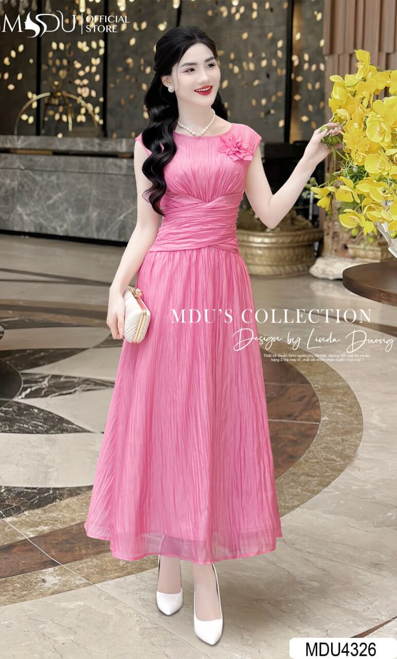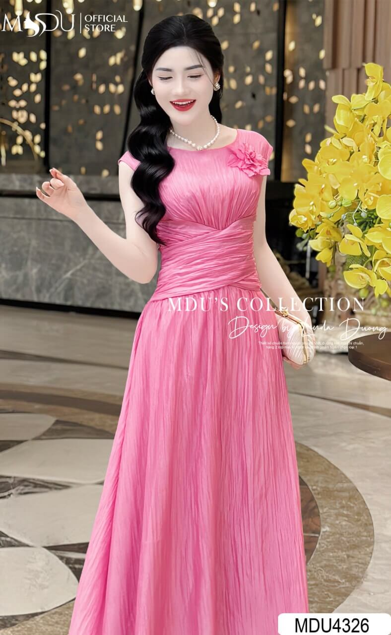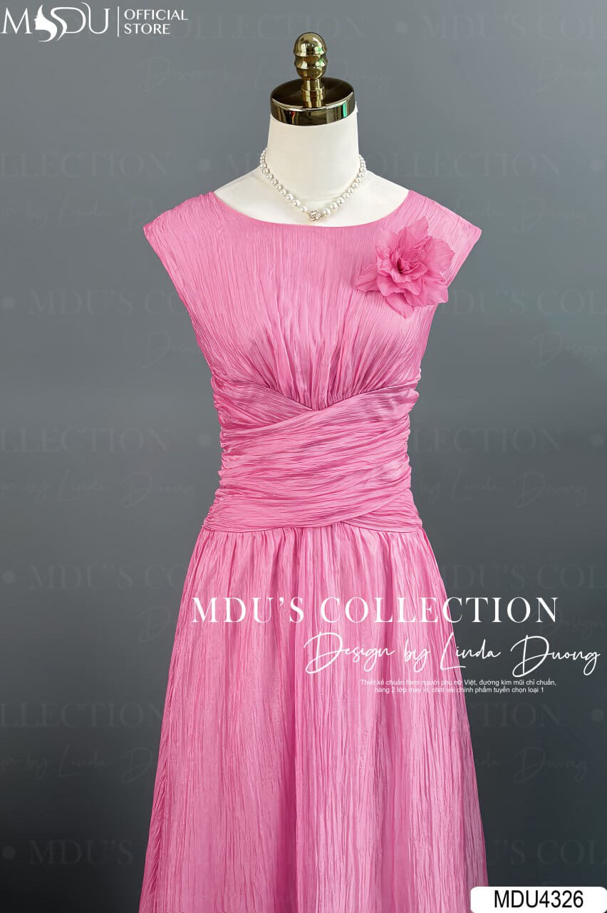Điểm nhấn của váy MDU4326 chính là gam màu hồng dịu dàng kết hợp với chi tiết hoa đính nổi tinh tế, tạo nên vẻ đẹp sang trọng và ngọt ngào. Dáng váy dài mang lại sự thanh thoát và quyến rũ, giúp tôn lên vẻ đẹp của người phụ nữ trong mọi sự kiện.