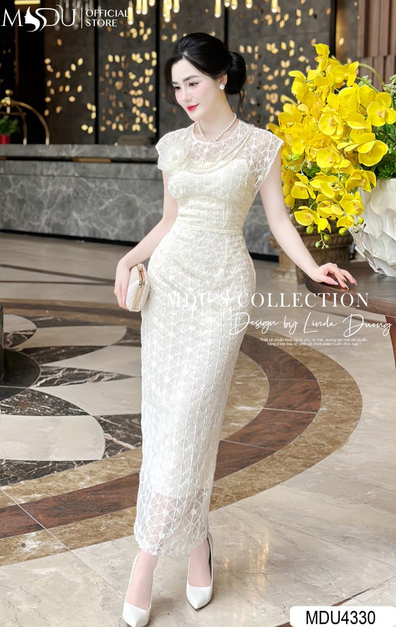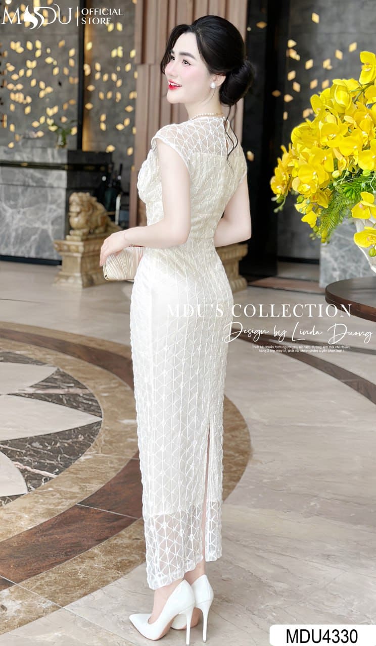 Váy MDU4330 sử dụng chất liệu vải loại 1 nhập khẩu, với độ bền và tính thẩm mỹ vượt trội. Màu kem thanh lịch, phù hợp với nhiều dịp khác nhau từ tiệc cưới, sự kiện quan trọng đến những buổi gặp gỡ bạn bè. Thiết kế váy dài ôm sát cơ thể, tôn lên đường cong quyến rũ của phái đẹp, đồng thời tạo cảm giác thoải mái khi di chuyển nhờ đường xẻ tinh tế phía sau.