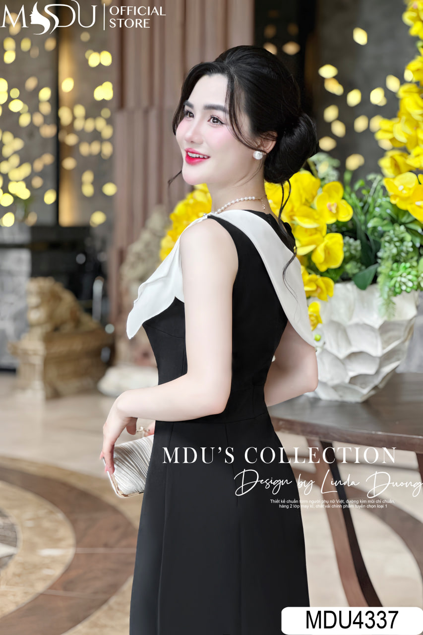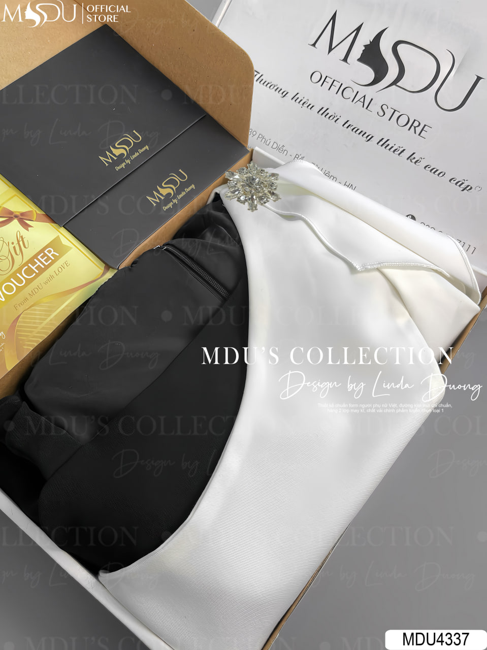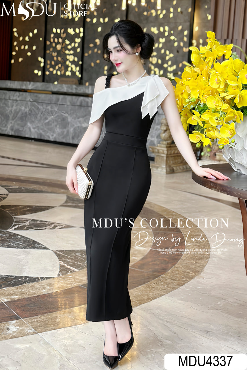 MDU4337 nổi bật với thiết kế lệch vai tinh tế. Màu đen phối trắng tạo nên vẻ đẹp thanh lịch và cuốn hút. Khóa sau được giấu kín, cùng với các đường may cẩn thận, tạo nên sự hoàn hảo và sang trọng. Thiết kế dập li bằng máy đảm bảo váy giữ được hình dáng sau nhiều lần giặt.