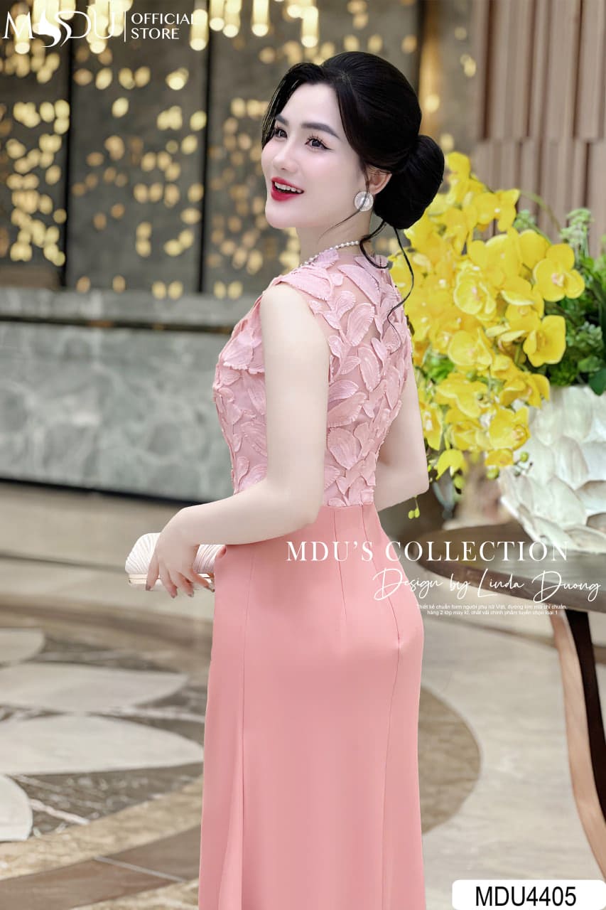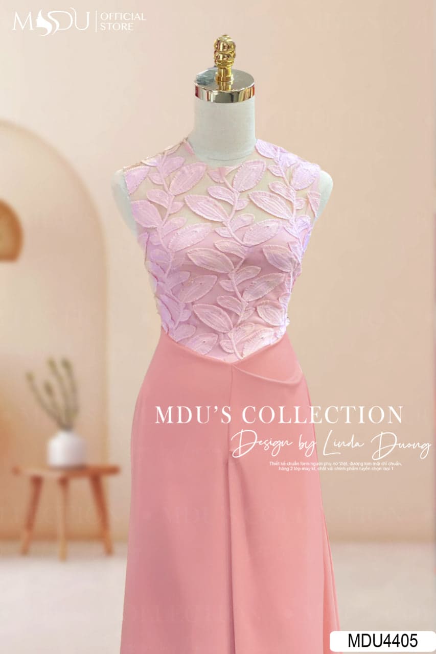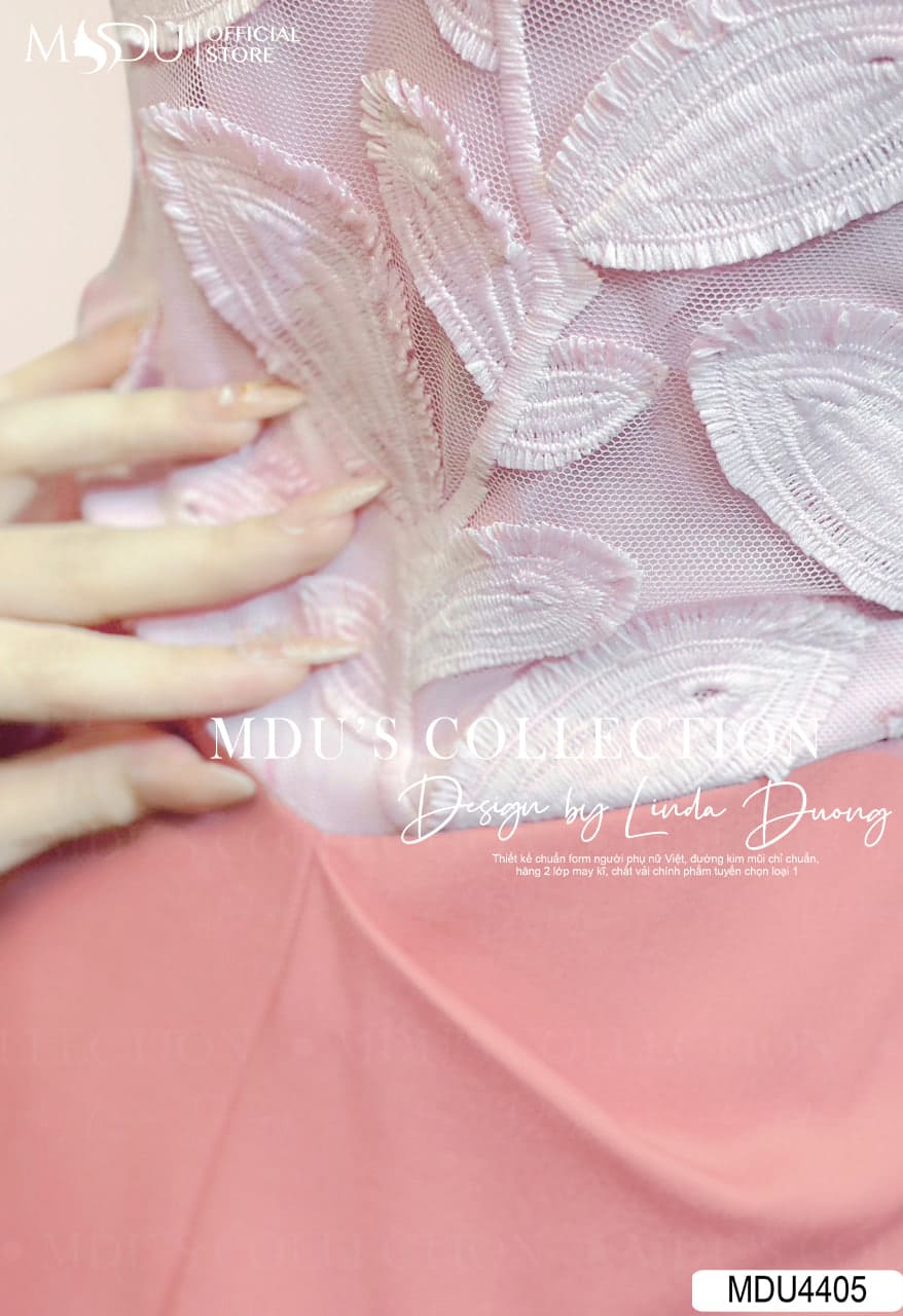 MDU4405 nổi bật với thiết kế hoạ lá cành trên nền ren, gam màu hồng pastel và hồng nhạt tạo nên sự lôi cuốn và thanh lịch. Váy được thiết kế 2 lớp dày dặn, không hở lộ, khóa bọc và dấu đường may cẩn thận, đảm bảo sự kín đáo và thoải mái khi mặc. Điểm nhấn của váy là chi tiết xẻ tà trước, giúp tôn lên vẻ đẹp gợi cảm và quyến rũ.
