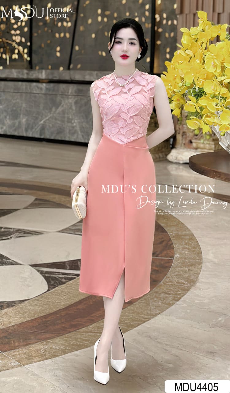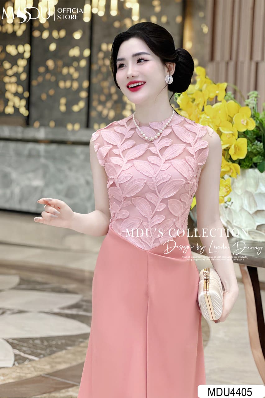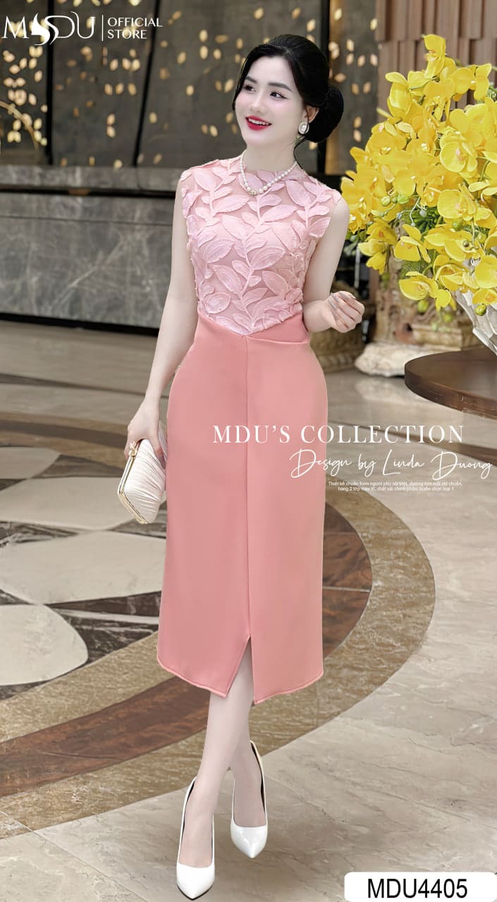 MDU4405 nổi bật với thiết kế hoạ lá cành trên nền ren, gam màu hồng pastel và hồng nhạt tạo nên sự lôi cuốn và thanh lịch. Váy được thiết kế 2 lớp dày dặn, không hở lộ, khóa bọc và dấu đường may cẩn thận, đảm bảo sự kín đáo và thoải mái khi mặc. Điểm nhấn của váy là chi tiết xẻ tà trước, giúp tôn lên vẻ đẹp gợi cảm và quyến rũ.