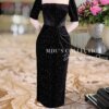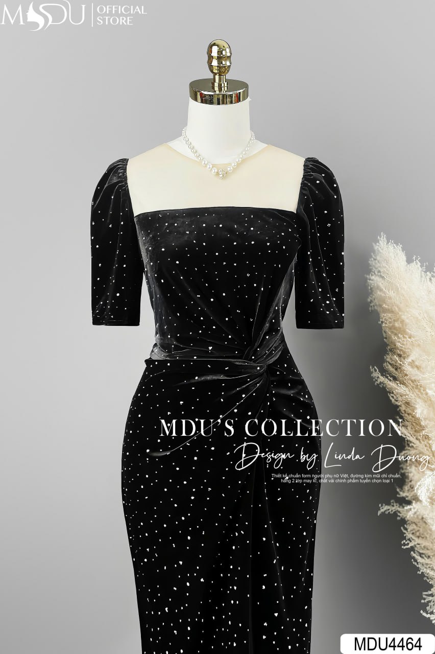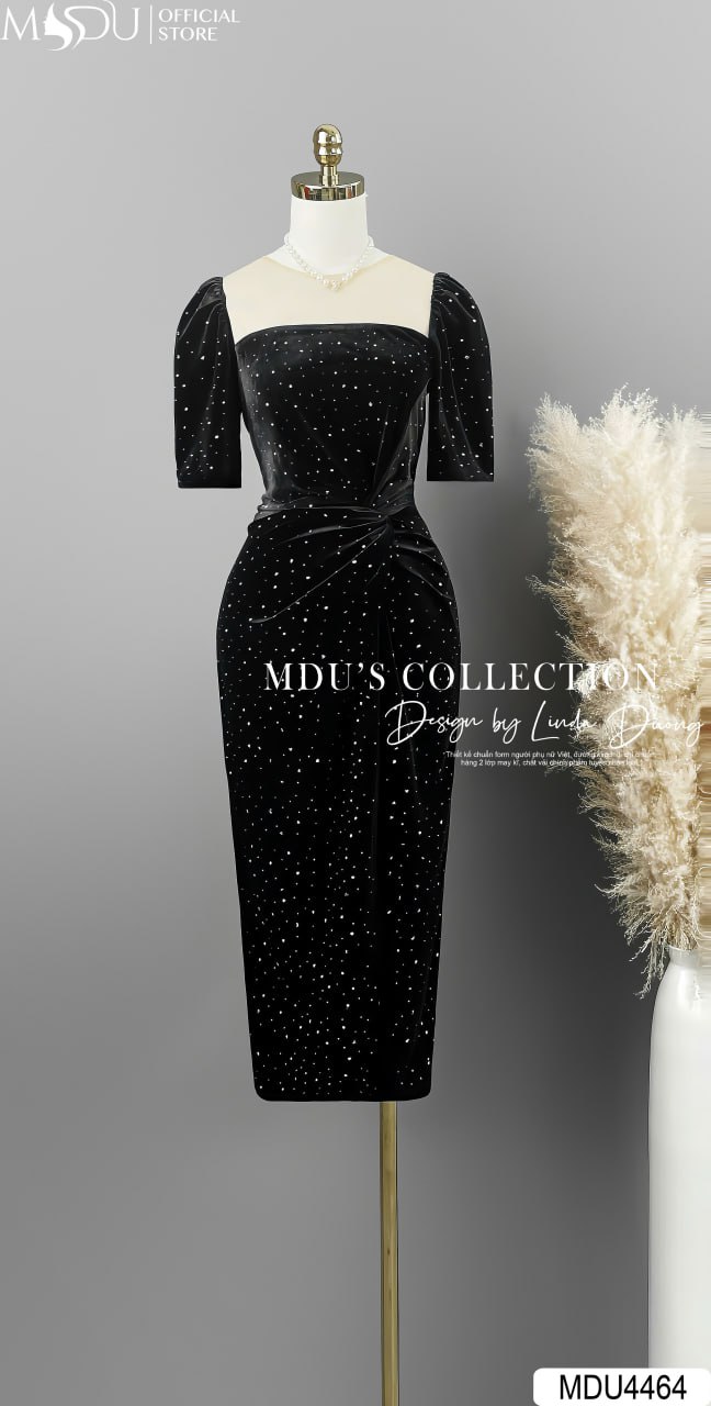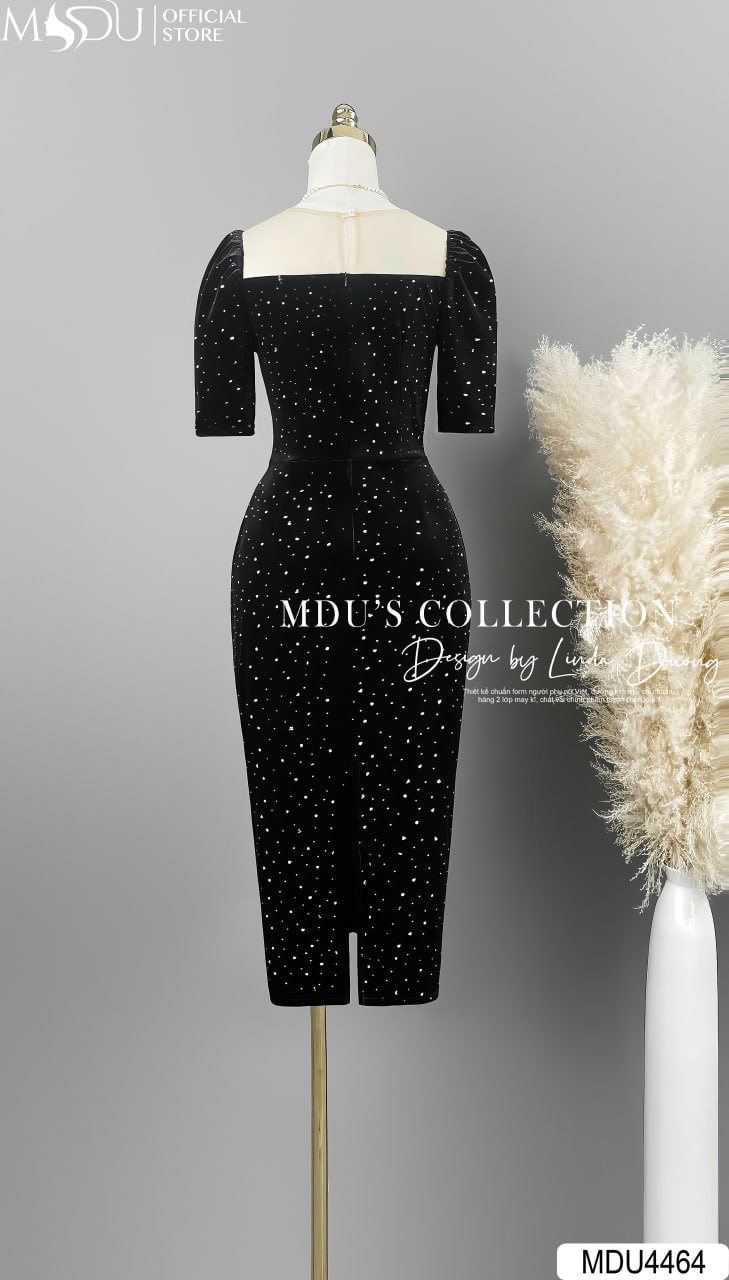 Váy Thiết Kế MDU4464 – Sự Hòa Quyện Giữa Màu Đen Quý Phái Và Chất Liệu Nhung Đính Kim Sa Cao Cấp