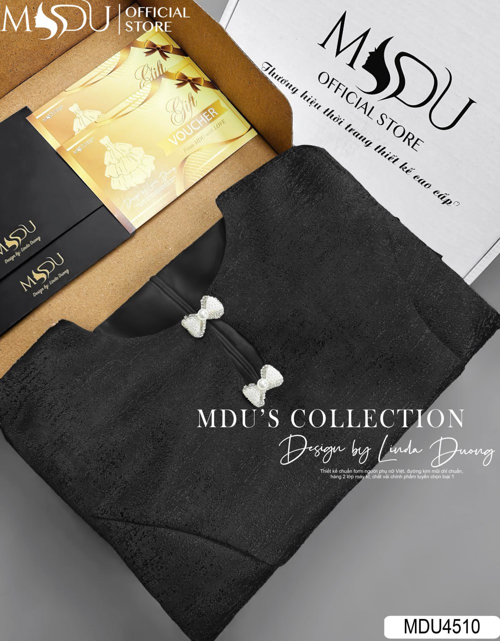 MDU Fashion, thương hiệu thời trang hàng đầu Việt Nam, hân hạnh giới thiệu mẫu váy thiết kế MDU4510 – biểu tượng của sự đẳng cấp và bí ẩn. Chiếc váy được chế tác từ chất liệu tafta gấm cao cấp, mang đến vẻ đẹp sang trọng, thanh lịch và đầy cuốn hút. Với gam màu đen huyền bí cùng thiết kế ôm eo tinh tế, MDU4510 là sự lựa chọn hoàn hảo để phái đẹp khẳng định phong cách trong các sự kiện quan trọng.