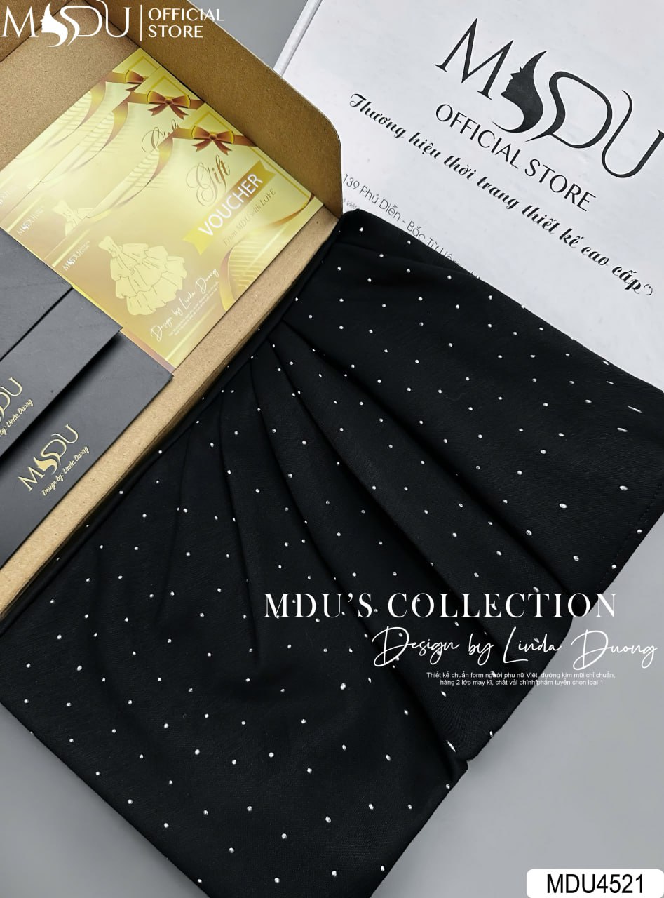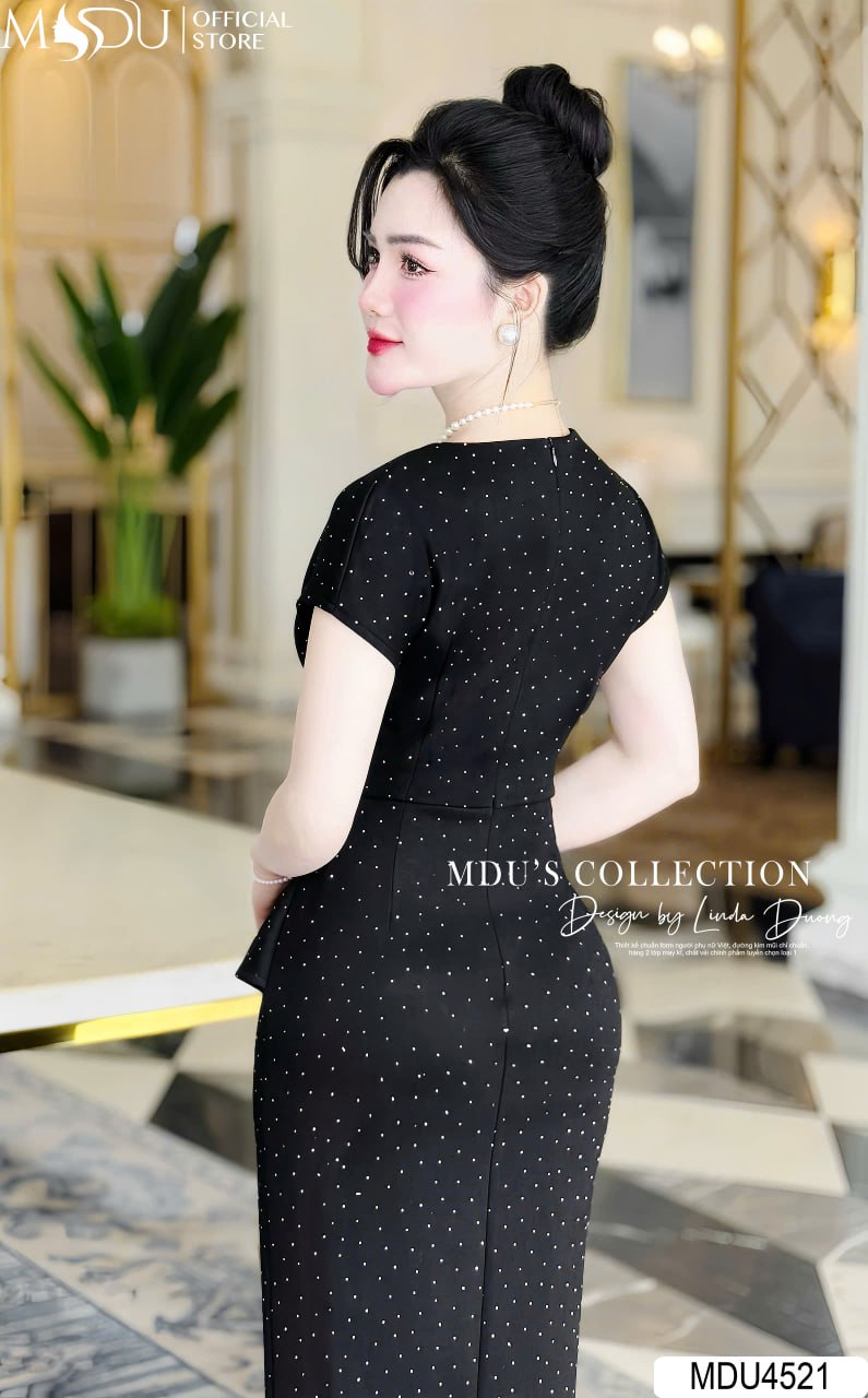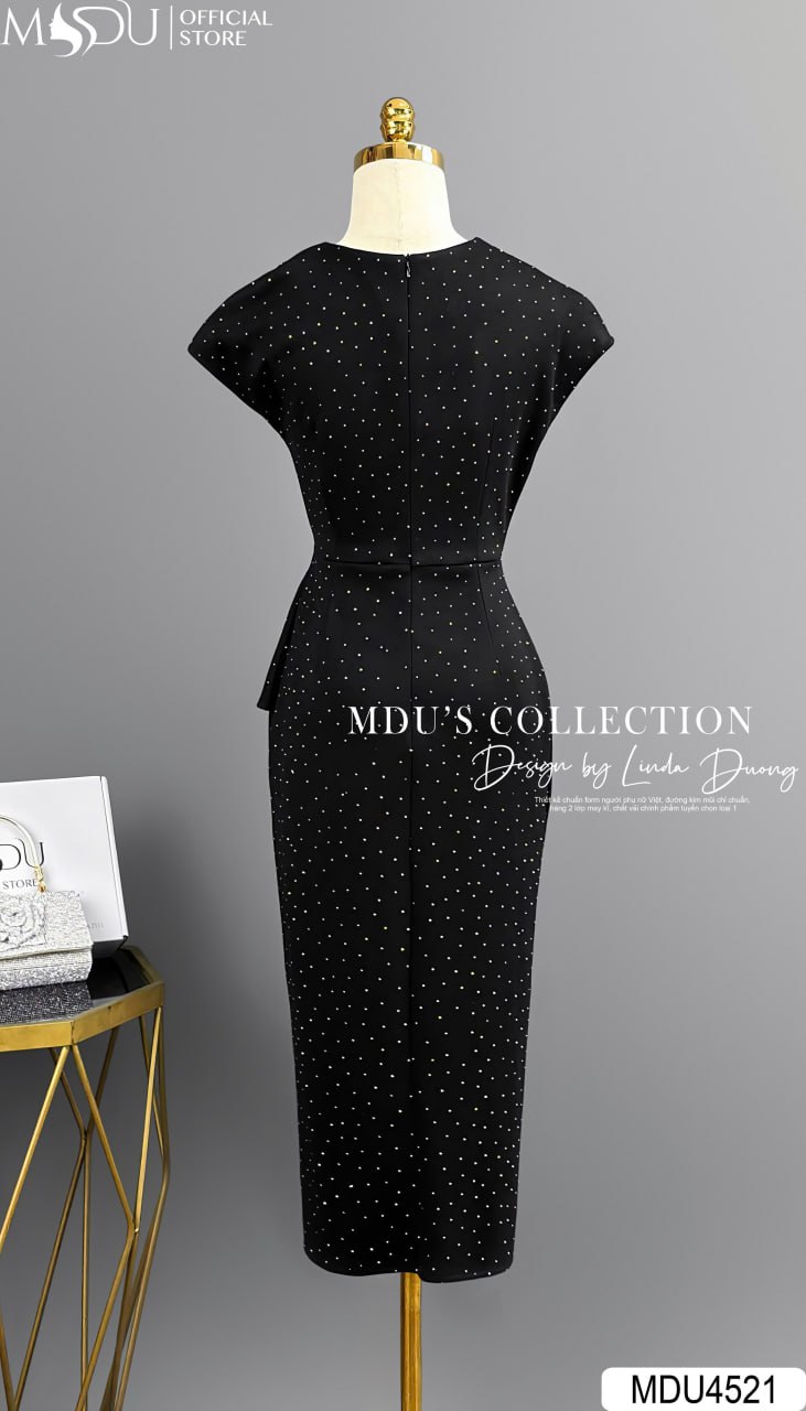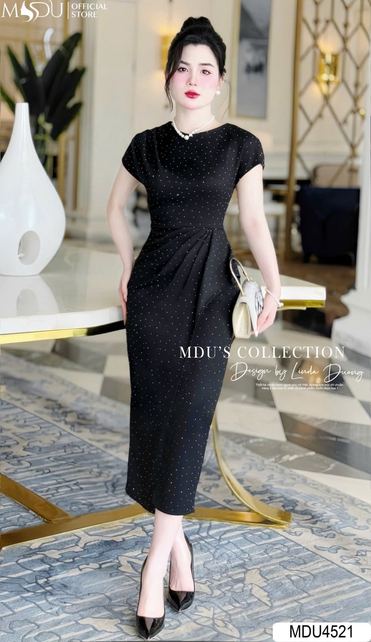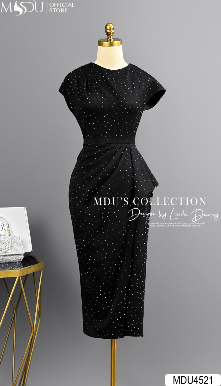 Mang sắc đen huyền bí, váy MDU4521 là hiện thân của vẻ đẹp quyền lực và quyến rũ. Phần thân váy ôm body tinh tế giúp tôn lên đường cong hoàn mỹ của cơ thể, trong khi các chi tiết đính kim sa lấp lánh tạo điểm nhấn lộng lẫy, giúp bạn tỏa sáng trong mọi không gian. Đây là lựa chọn hoàn hảo cho các buổi tiệc tối, sự kiện quan trọng hay những dịp cần sự thu hút nổi bật.